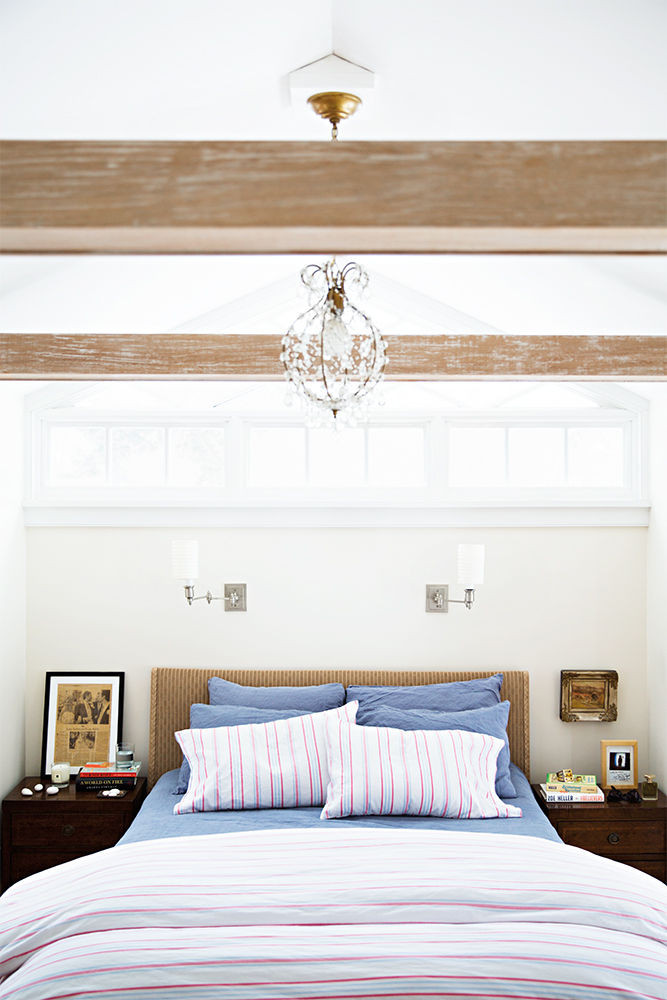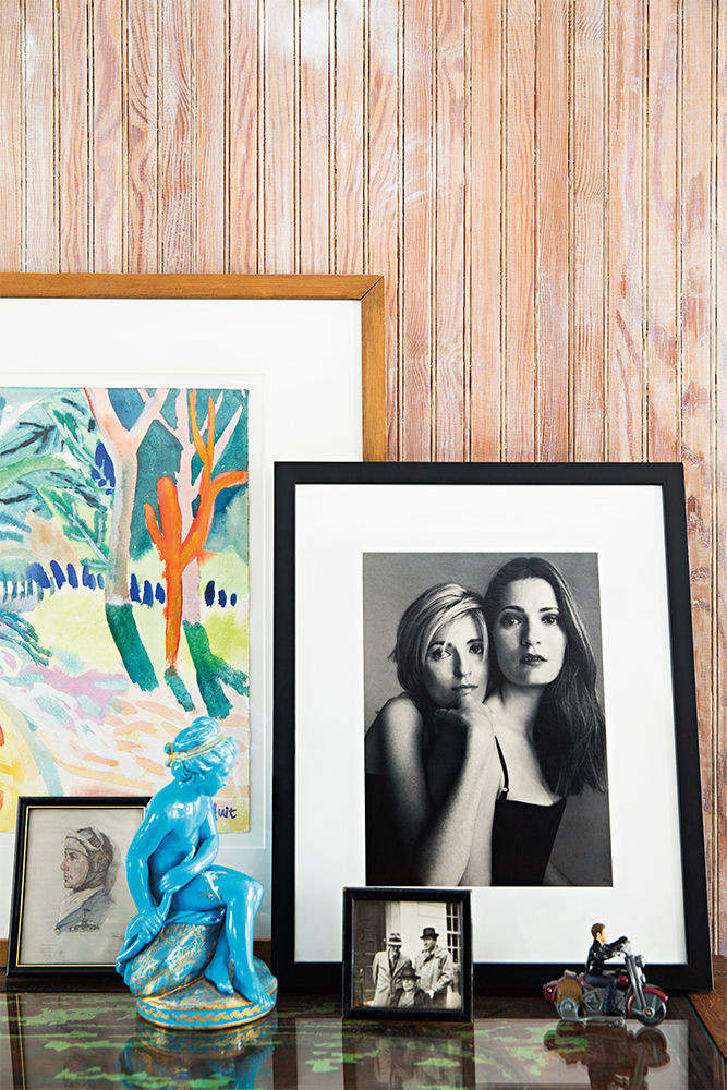 These days, the family, which now includes sons Heathcliff and Titus, spends most weekends in Bridgehampton watching movies, playing video games, and strolling along nearby Ocean Road Beach. Scattered throughout the home are touches of the couple’s English bohemian style: vintage fashion photographs, love-worn Turkish blankets, and art collected during Rellie’s travels through Asia. But, despite the cottage’s treasures, the muted walls, oak floors, and wooden beams reveal its rustic charm. “The floorboards might moan and the windows creak,” Sykes says. “But it’s the soul of the house that really matters.”