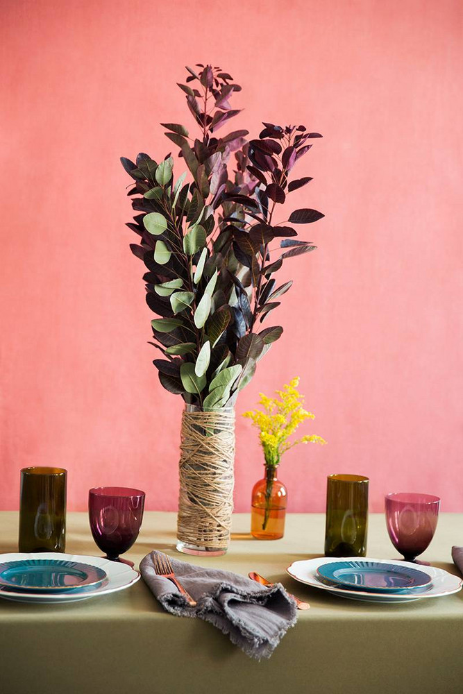 It’s as easy as picking up stray branches from your yard or the park—leaves or no leaves—for a natural, free, and seasonal centerpiece. Create additional visual interest by wrapping twine or ribbon around a vase and congratulate yourself on creating the most budget-friendly centerpiece ever.