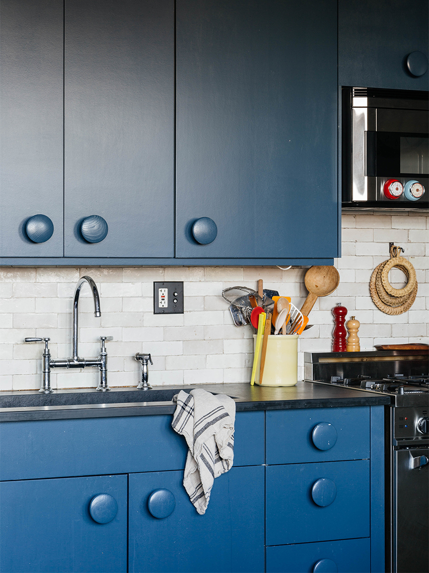 Once you have the IKEA units installed, recruit a few pots of paint to take them to the next level. Murphy suggests painting the uppers a different color than the lowers; a darker hue on the base cabinets will ground the room. Finally, splash out on the hardware. Etsy and eBay are great for finding truly one-of-a-kind pieces at attainable price points—just be sure to get specific with your keyword searches to score the best deals.