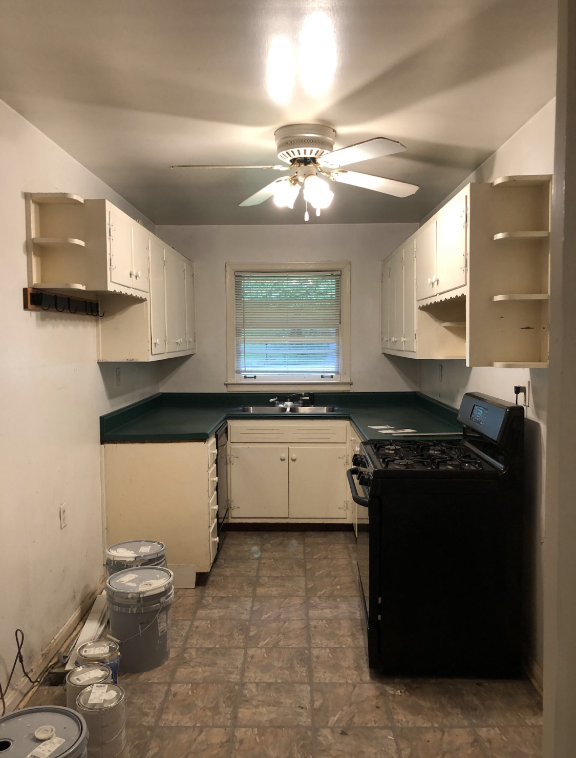 The same contractor we brought in to check out the asbestos also helped us take down the two load-bearing walls that separated the kitchen from the living space. I wanted to have somebody there just to be safe, so everything didn’t come caving in on us. Finally, we put in two beam joists (the most costly update).