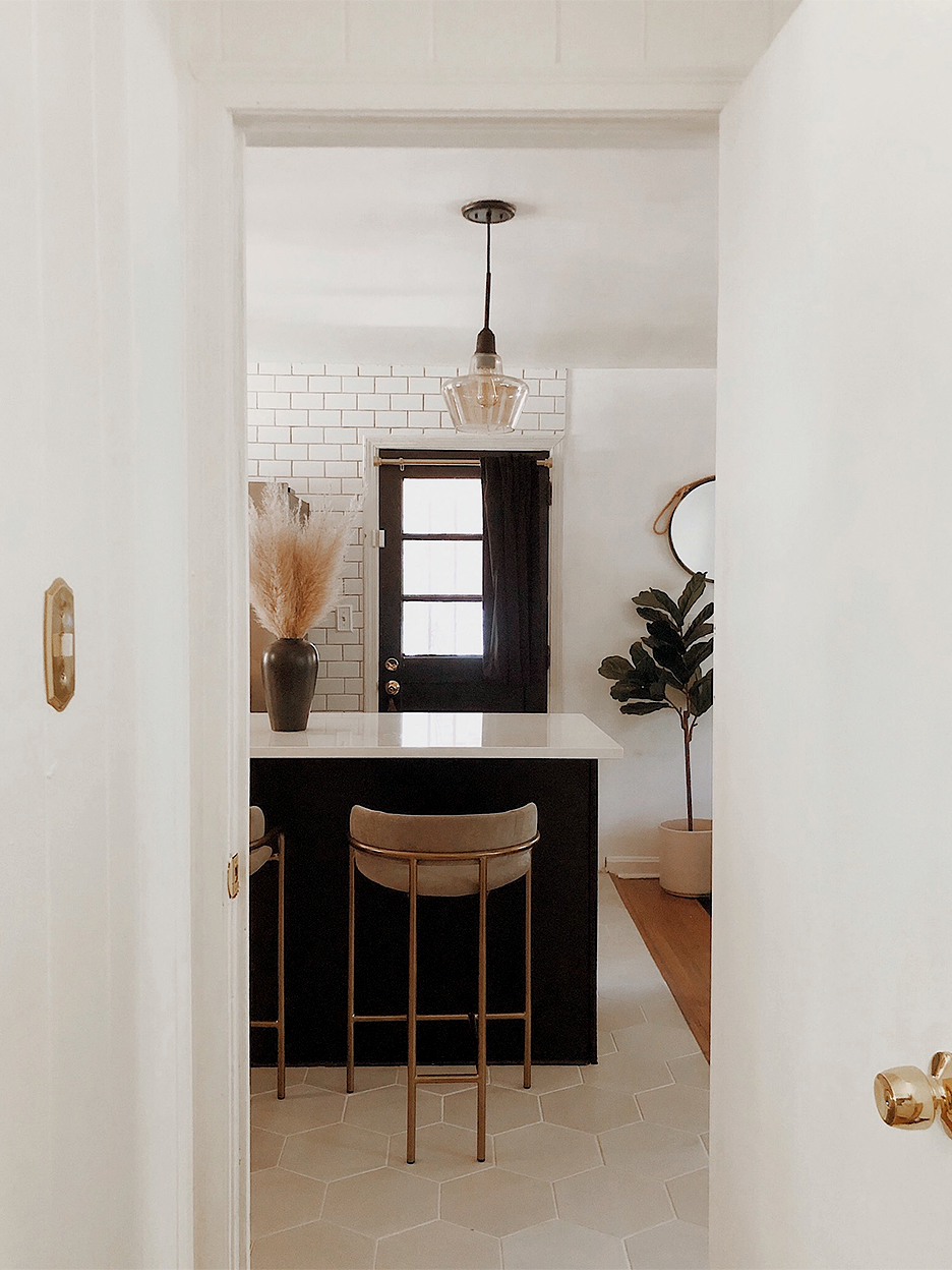 After looking into the appraisal process, I learned that taking the backsplash up to the ceiling would add more value to the home. After getting a few tips from my dad, who has done contracting work in the past, I tackled the backsplash myself (saving around $2,500 in labor). The trick I learned right away was to use a leveler to make sure everything is even. (Some DIYers will rely solely on their eye, and the pattern will end up so quirky and crazy in the end.) When I encountered outlets or windows, I used a tile saw and cutter to slice the edges to fit. Finishes were extra-important to me. I wanted to make sure that whomever owns this home next loves it despite the fact that it’s got a galley feeling.