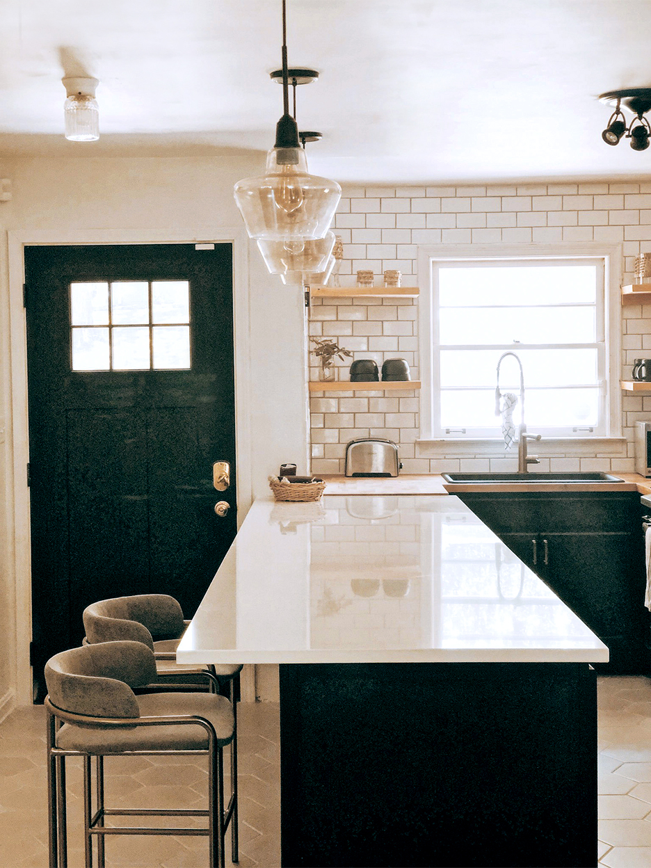 The one thing I let my husband pick out was the quartz countertops. It was a really personal thing for him; he’d always wanted a home with white counters. They were a splurge, so we decided to save $2,000 by doing the back half in butcher block. Because the two surfaces aren’t running in a straight line, it doesn’t feel choppy. I stained and finished the wood myself. I’ve chopped food directly on it with no issues, but my husband is very particular about my using a cutting board. The kitchen is his thing—it has to be clean.