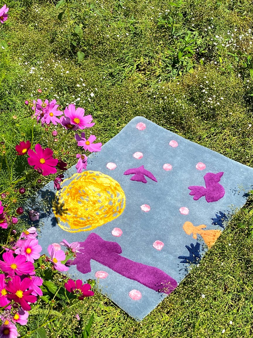 Kamden’s picturesque rendition of a landscape is like a painting for your floor. “I was imagining a rug maker surrounded by birds,” he says. “My favorite part is the girl in the grass.”