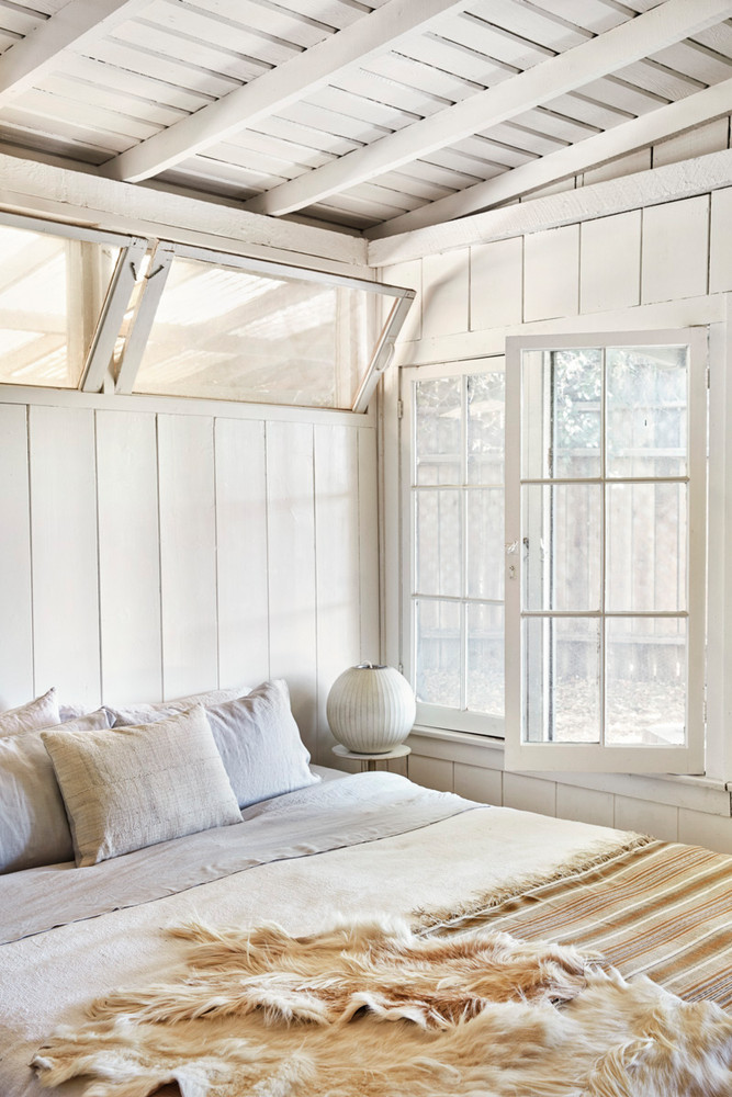 Earthy tones and natural elements, such as linen bedding and a sheepskin throw—a nod to the space’s past as a hunting cabin—infuse organic grace, and connect this hunting cabin turned family refuge to its scenic Topanga surroundings.