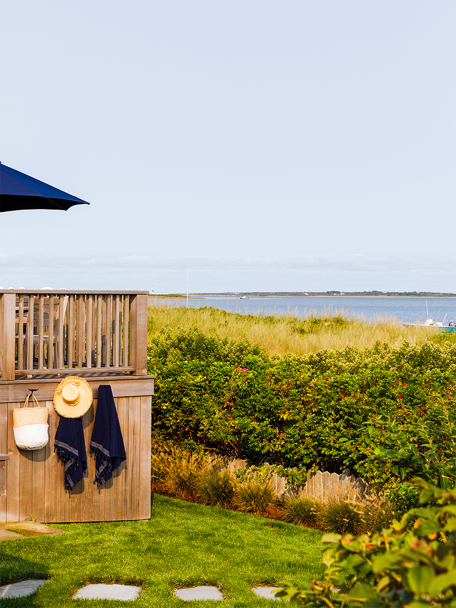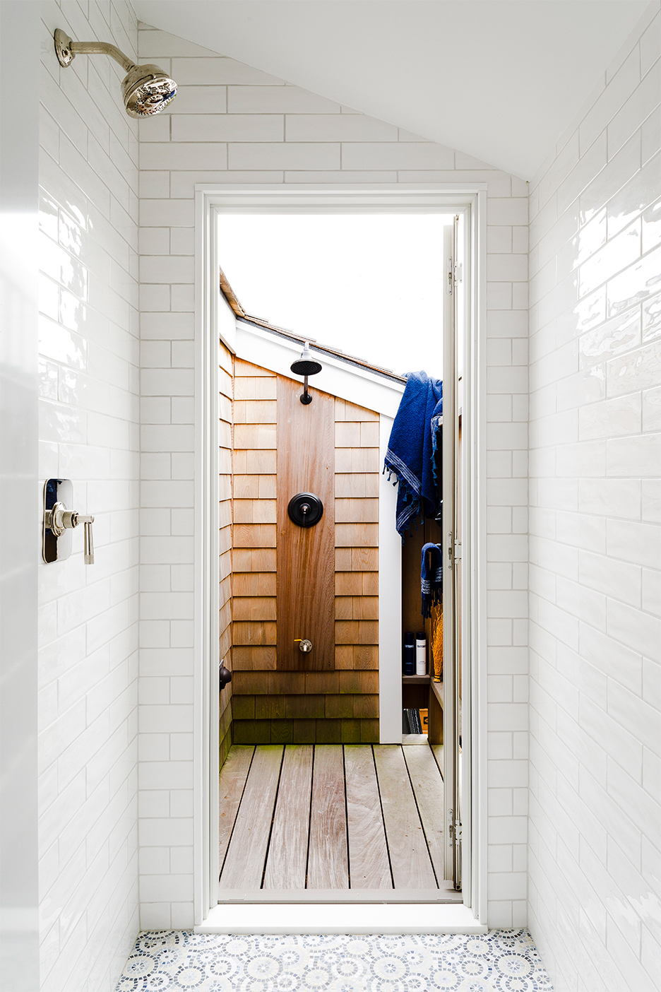 Upstairs brought the most clever blueprint tweak of all: adding two extra outdoor showers (there’s now a total of three on the property) accessible from the main and guest baths. “In the summertime you can just walk right through your own shower and be outside; it’s very private,” says Babcock. For subtle island charm, the couple commissioned whale-shaped wood door handles and picked up brass whale tail hooks for towels and swimsuits.