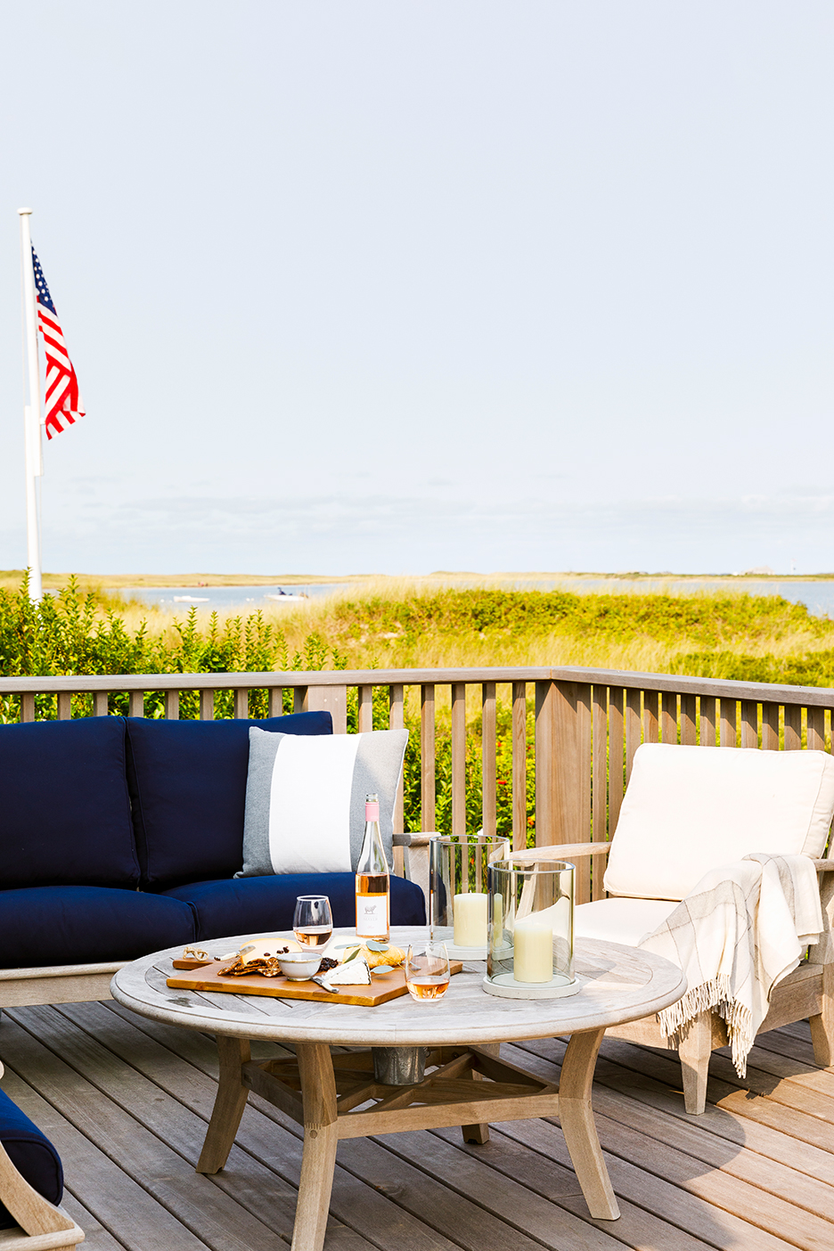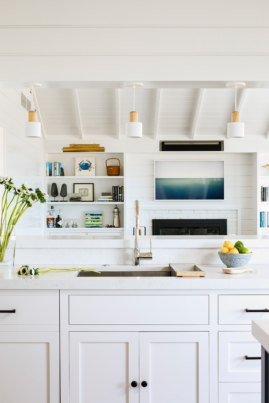 Save for the breakfast nook, the house no longer has a formal dining space. Instead Babcock opted for multiple living areas: one cozier, centered around the fireplace for cool nights, and the other with an airy white sectional that overlooks the beach. “The family eats outside most of the time when they’re there,” she points out.