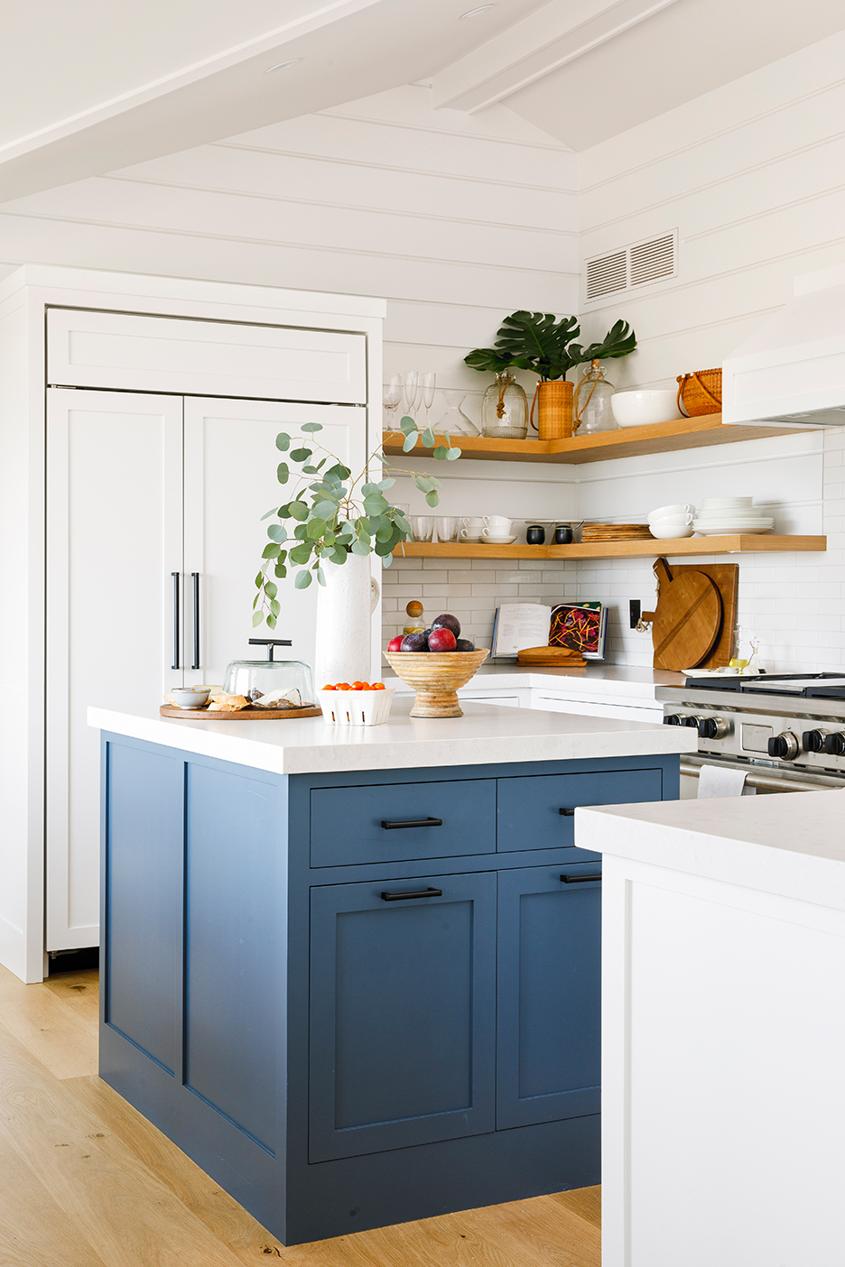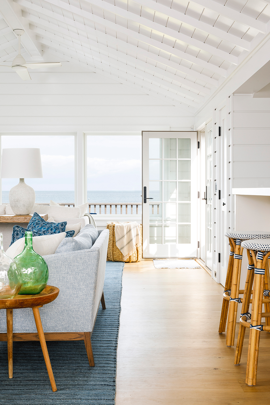 Although the kitchen layout didn’t move around, everything else was reimagined. Babcock scrapped the upper cabinets in favor of open shelves, and swapped out a peninsula that separated the dining area for an island with prime views of the ocean from the bay window. A door leads to a seafoam-hued pantry, which hides a coffee bar, wine fridge, and even a second oven. The other counter, which stands between the cooking space and the living area, is intentionally bar height. “It hides the mess and the kitchen sink,” explains the designer.