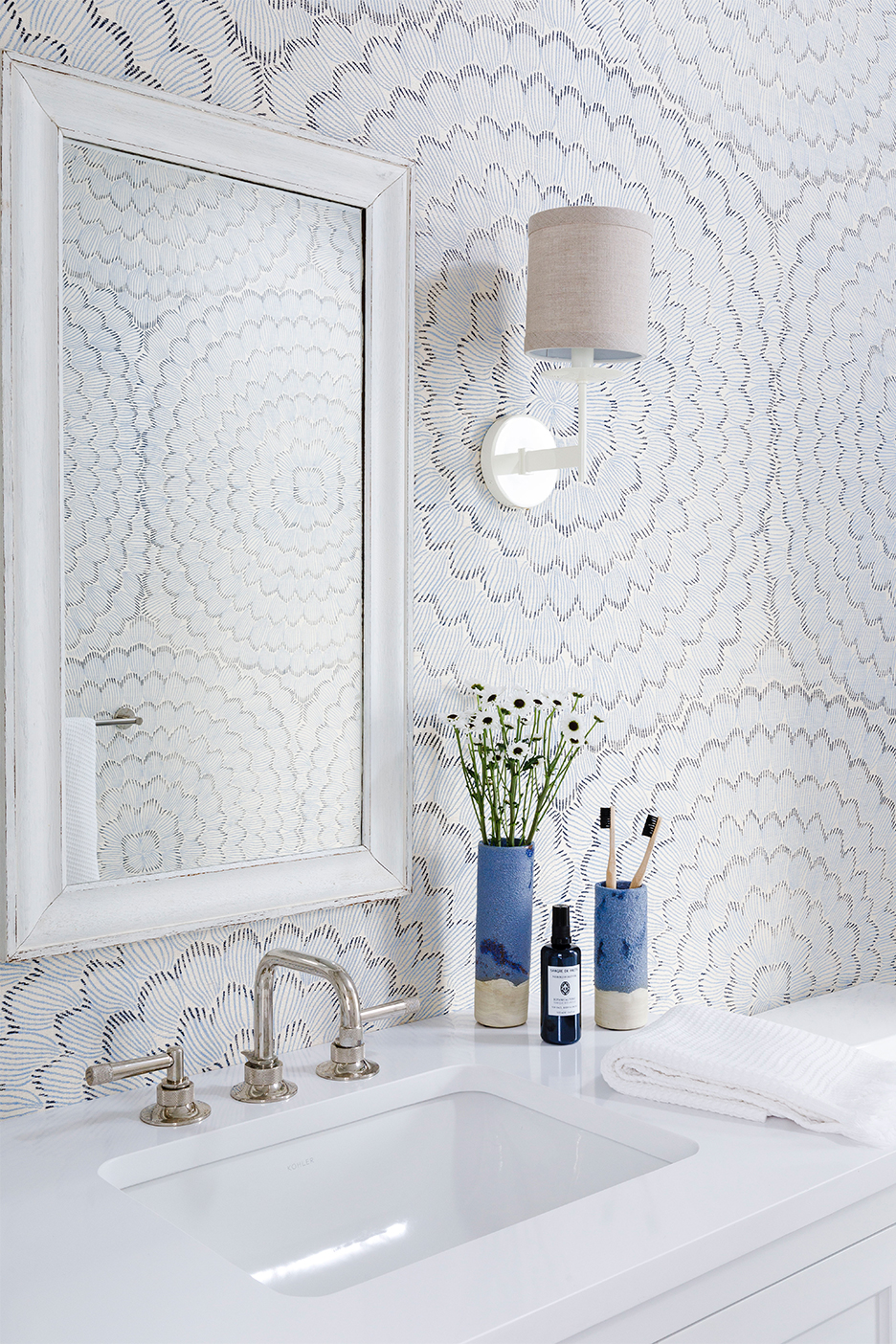 The primary bath is so spacious thanks to more design Tetris in the en suite; Babcock carved out additional space for it (and the closets) by shrinking the sleeping quarters. Instead of attempting to squeeze in tiny nightstands in the smaller room, the designer had the bed framed with tall shelves and upholstered the wall in between. “You see this a lot in French hotels and London homes,” she says. “It really makes the best use of space.”