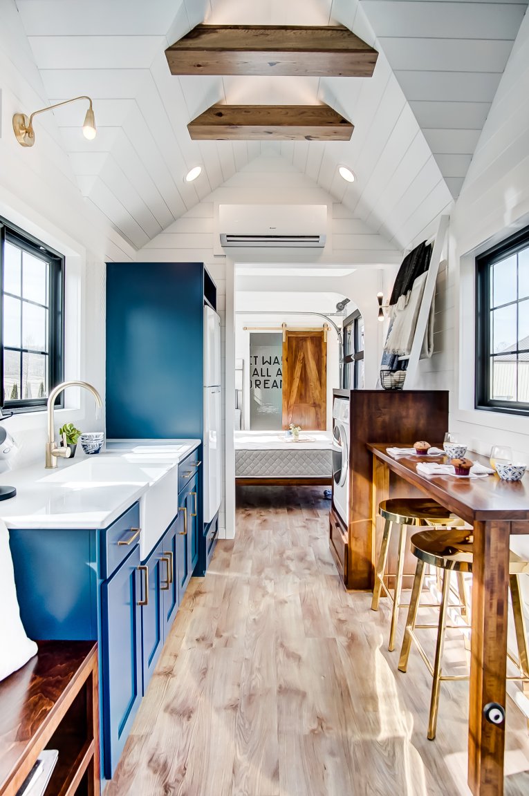 Standout design details in the cozy abode include brass accents, whitewashed wood paneling throughout, a quotable shower moment, a wood-clad laundry station, and a rustic breakfast bar for two. For warm summer nights and ultimate viewing pleasure, the master bedroom is positioned in a breezeway with garage doors on one side and French doors on the other. Though, if we were to re-create any moment in this tiny paradise in a full-size home, it would be that dreamy blue-and-white kitchen.