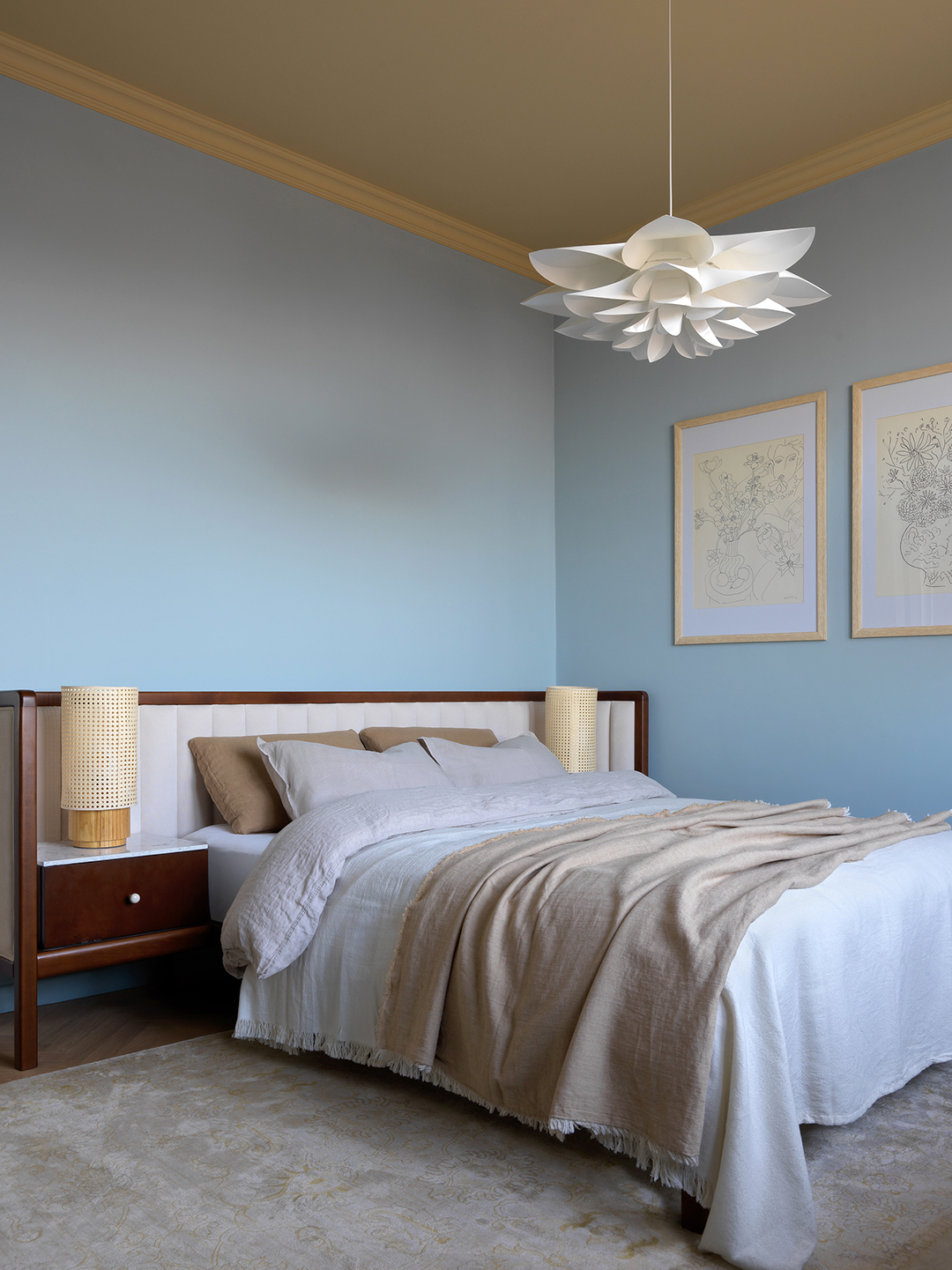 The breezy blue hue continues around the door casings, wainscoting, and stair risers, where Mussakulova employed a custom paint color. And by bringing in another playful, powerful color (yellow!), she ensured the place didn’t feel too neutral or “like a chain hotel.” “That may be tempting and appealing to some, but we tilted toward quite the opposite and came up with this scheme,” she says. “Blue and yellow are a mix of tranquility and energy at the same time.”