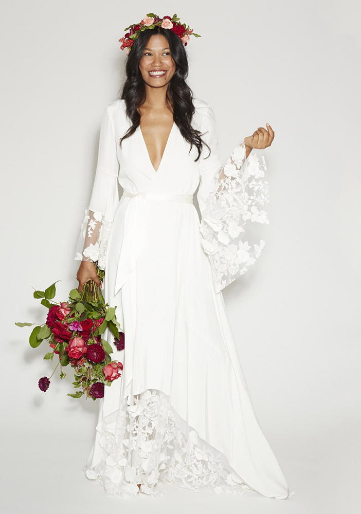 For the modern bride who’s not afraid to make a statement, we’re all for this chic jumpsuit with a textured off-the-shoulder lamb wrap, from Theia.