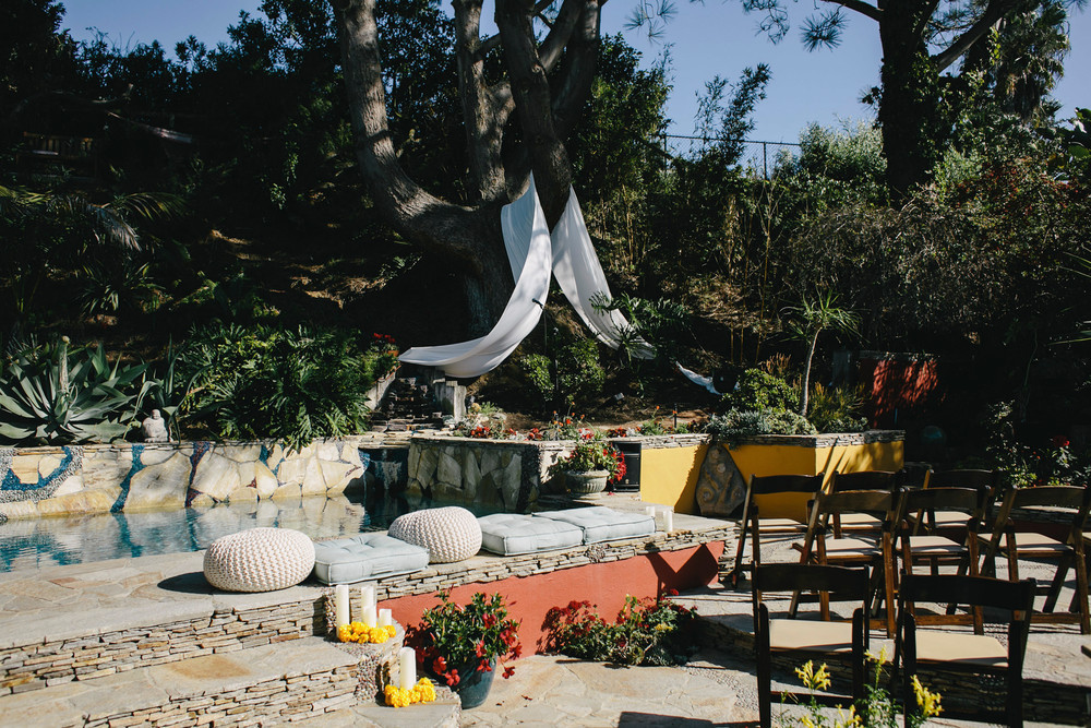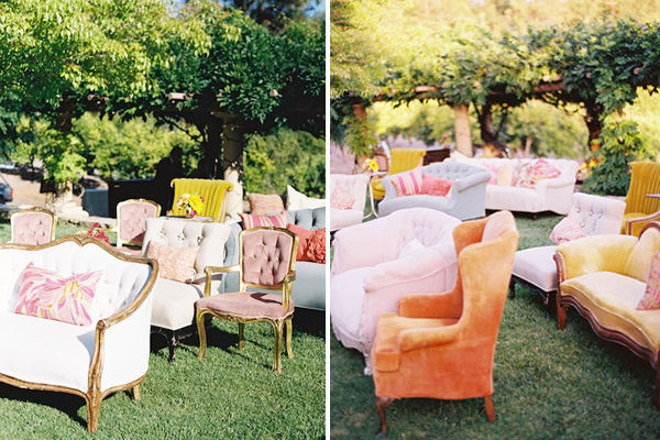 Opt for an eclectic mix of seating solutions for the ceremony, in lieu of the traditional side chair. Stick to an exclusive pattern of complementary shades to keep the look cohesive.