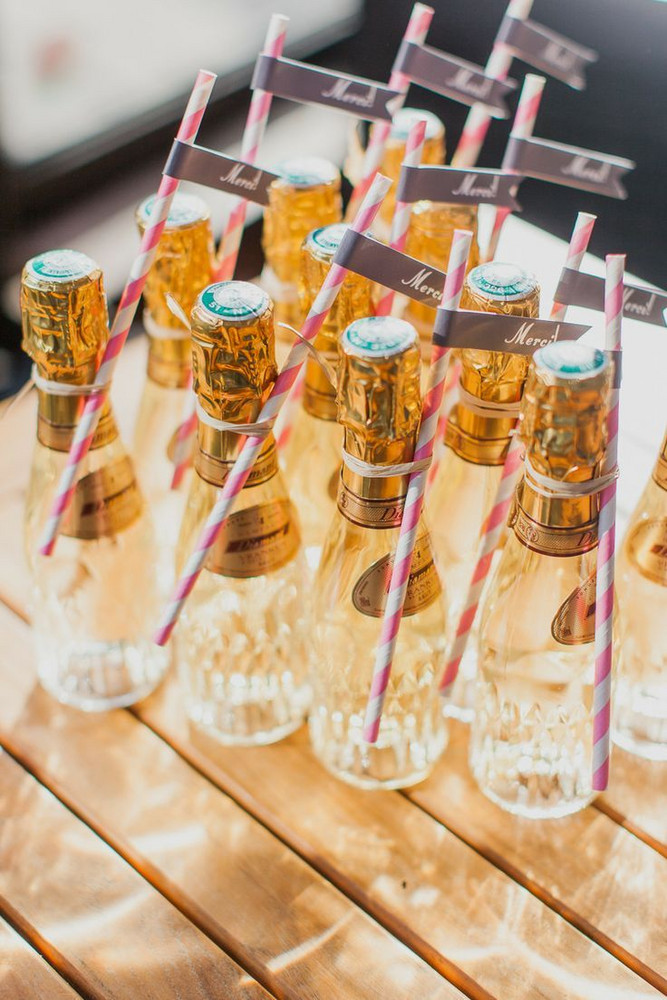 Send guests off with mini bottles of bubbly strapped with personalized straws.