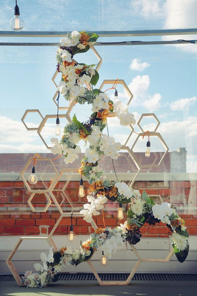 This honeycomb-inspired backdrop, interspersed with hanging bulbs and a stunning floral arrangement, is the ultimate backdrop for the urban wedding.