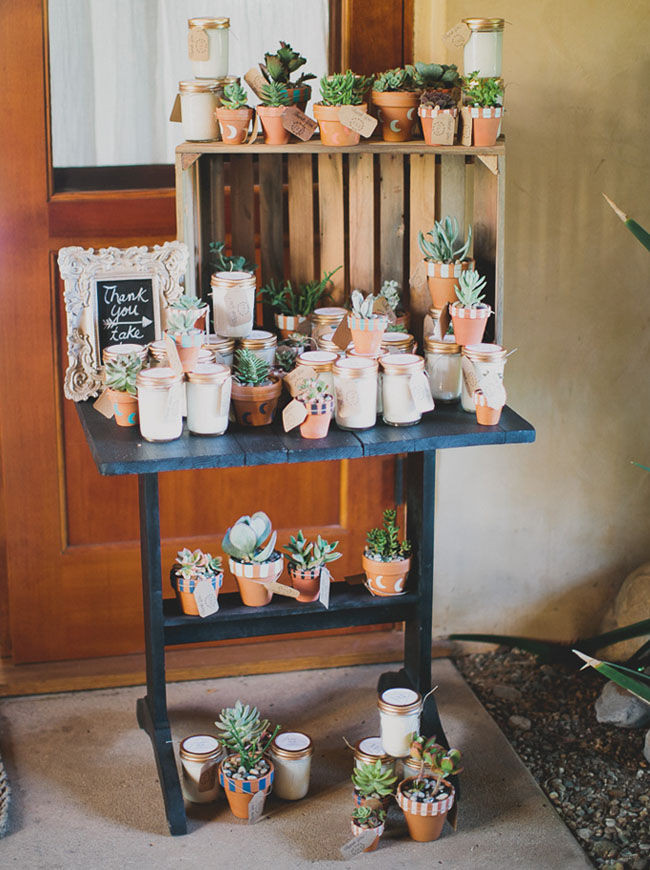 As far as wedding favors go, a little variety never hurt. An eclectic mix of southwestern-inspired pieces (think cacti and candles) will surely please.