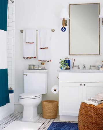 A gorgeous slab of natural stone in a bathroom is an incredible way to add warmth and an organic element. Natural stone is not always cheap, so a great way to get the look of a natural stone without the hefty price tag is to buy tiles cut from materials like marble, or travertine. There are some beautiful options out there of hexagonal, or