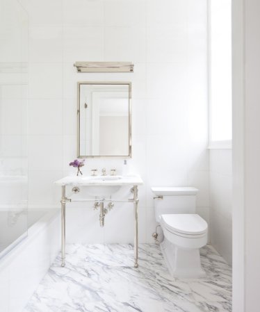 in various natural stone. Try tiling a shower or a sink backsplash with the tile material if you can’t afford to splash out on a slab. In this remodel we went a little marble crazy in the tub, and on the vanity counter top. We cut some budget corners in the shower by not doing any solid slabs and instead used the same Calcutta marble but in Hexagonal tile sheets which were significantly less expensive.