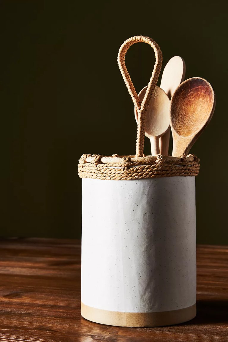 Meet our top pick. This ceramic utensil holder easily livens up any countertop, but the handle makes it perfect for a to-go situation. Use it to carry cutlery outside for a backyard dinner. The divide ensures that you’ll grab the right fork every time—something that can’t be said when you toss all your tools in a basket.