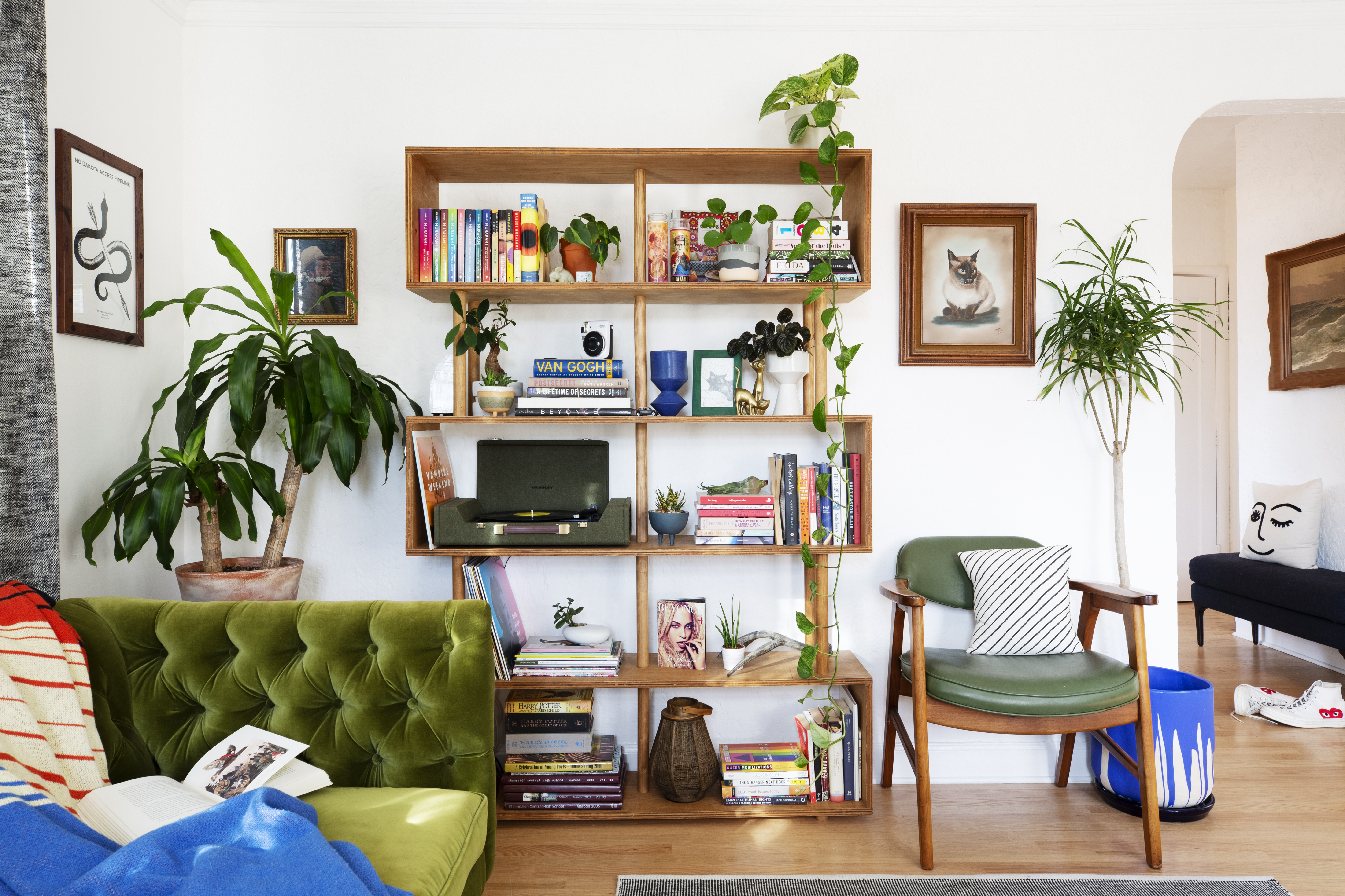 Plants are yet another standout decorative theme—eclectic clusters of vibrant greens can be found in nearly every corner of the home. The counters framing the kitchen sink are no exception. “I spend a lot of time at that sink and love that it’s original to the apartment,” says Barlow.