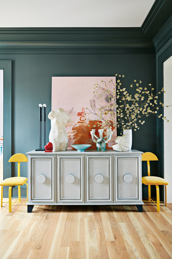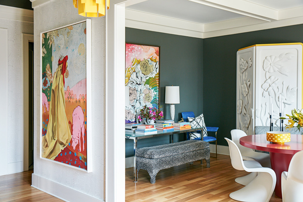 Wood cutouts of one of her signature paintings, the graphic black-and-white Ribbon #5, hang above the Missoni carpet–lined stairway. A taxi-yellow metal light fixture, cobbled together from a vintage frame and metal pieces her brother made in his shop, is suspended from the deep gray ceilings. In the living and dining rooms, charcoal walls provide the backdrop for a riot of color.