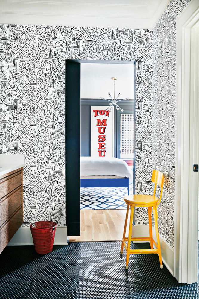 Instead of investing in potentially pricey (and more permanent) tile, Blehm used high-gloss enamel to paint stripes on her wood floors—as well as to create patterns on the ceiling (what she refers to as “the fifth wall”).