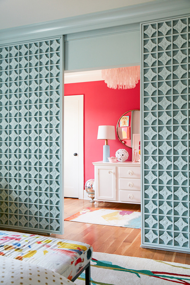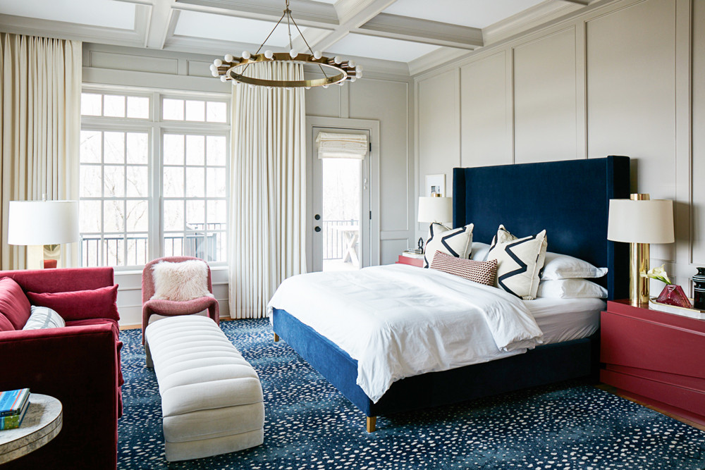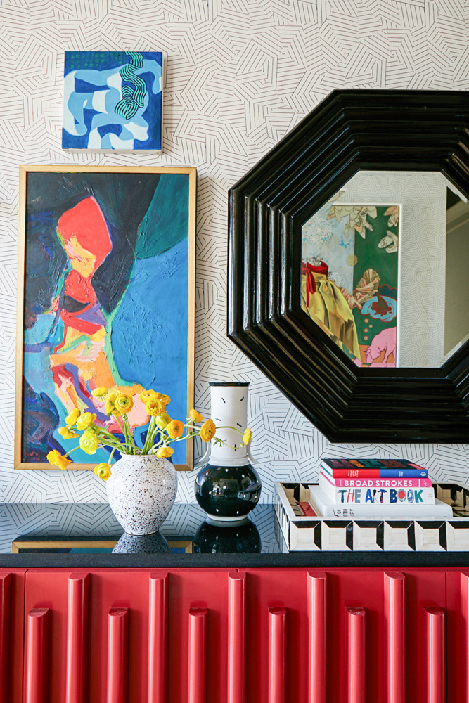 The family had followed job opportunities to North Carolina and Atlanta, but it wasn’t until they found this home, with a lake view, high ceilings, and loads of untapped potential, that Blehm’s vision really took shape. Lipstick-red walls, patterned ceilings, and large-scale contemporary art and sculptures in every room—along with an impressive collection of repurposed and custom-made modern furniture—create a vibrant whole. (It comes as no surprise that friends of the Blehm children think they live in a museum.)