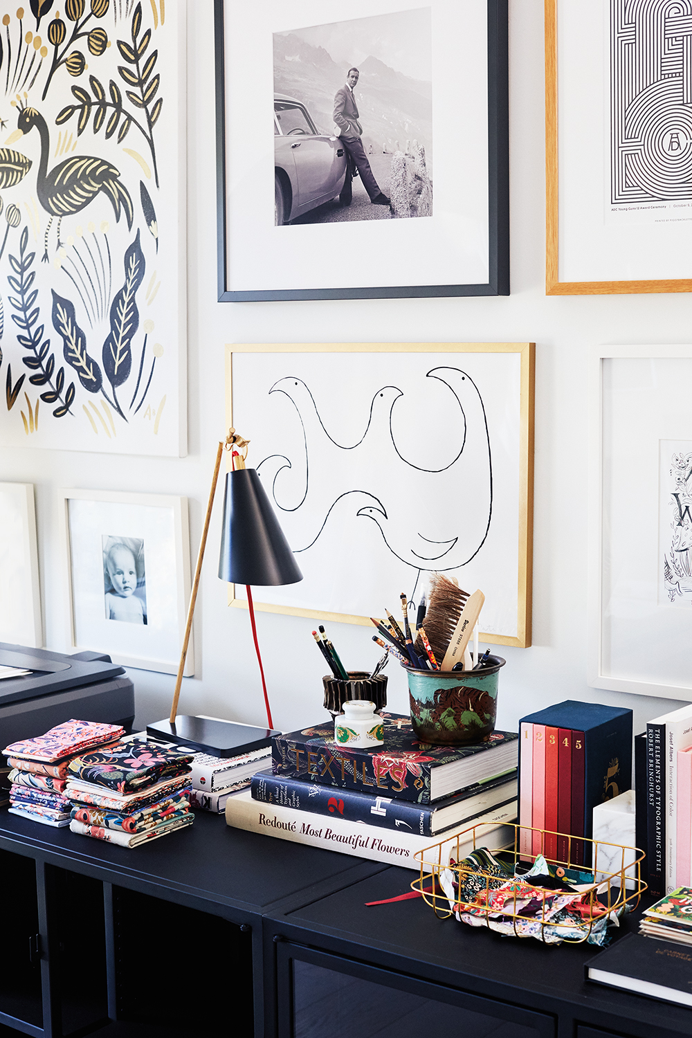 Anna Bond’s gouache paintings of rich blooms and velvet-like leaves are synonymous with artful vintage style, yet the Florida home she shares with her husband, Nathan, and son Ford (with a baby on the way) is surprisingly minimal. “I like things serene and clean,” says Bond, who keeps a light-filled studio for Rifle Paper Co. designs in a spare room of the house. “I do most of my creative work at home, and I need it to be calm.”