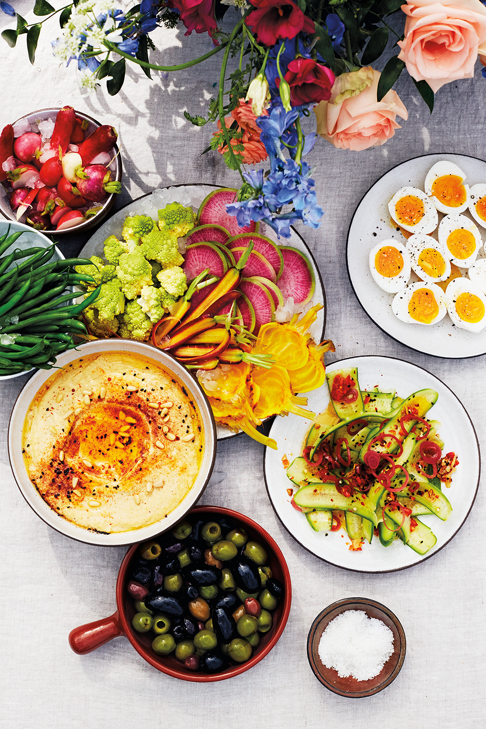 A fan of easy-to-prep, healthy ingredients, Bennett elevated a store-bought hummus with spices, seeds, and good olive oil—while the crudité plate and cucumber salad with pickled onion required not much more than a mandoline. (Another trick: Salt the water before freezing it and your ice will last longer.) Plus, six-minute eggs mean no messy pans to clean up after.