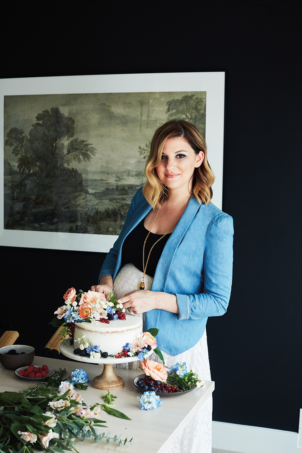 To finish, Bond served a white buttercream cake she decorated with roses, ranunculus, delphinium blooms, and berries. Glasses in hand, the party moved outside, and the crew finished the afternoon by taking a boat out on the lake. “I have such a regimented schedule every day; this lets me enjoy a free afternoon with no agenda,” Bennett explains. “I love brunches because there’s no end time.”