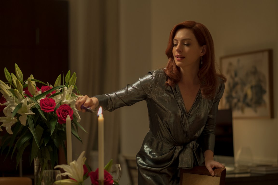 The first peek we get of Hathaway’s apartment is when she walks through the door and tosses her keys on a gilded antique corner shelf. Even though there’s zero formal entryway to speak of, the mirror-backed piece makes the tiny nook feel like one. (Plus, it’s just a chic approach to traditional storage.)