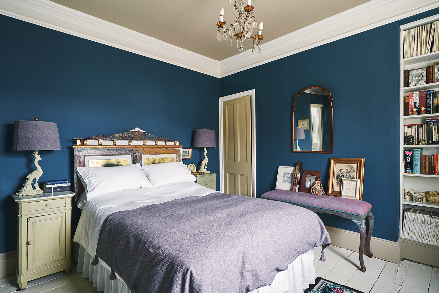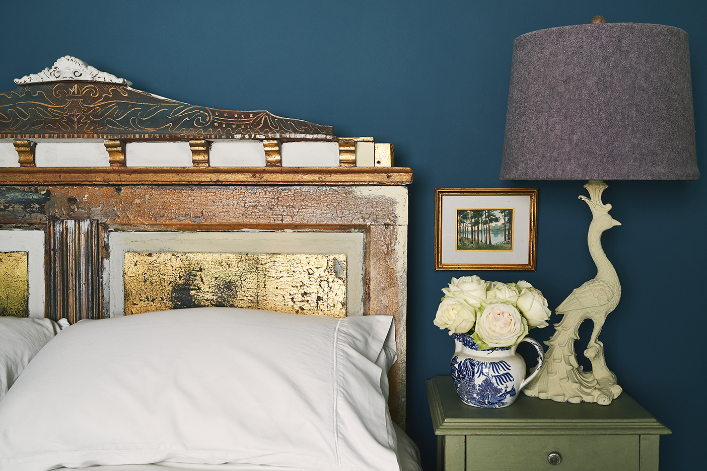 While splashy red was a solid fit for the dining room, Sloan steers clear of warm hues in the bedroom, including bright whites. “I want something deep and nonchallenging,” she explains. The palette is an ode to Versailles, featuring grayish greens, muted violets (all the fabrics are Annie Sloan designs), and hints of gold.