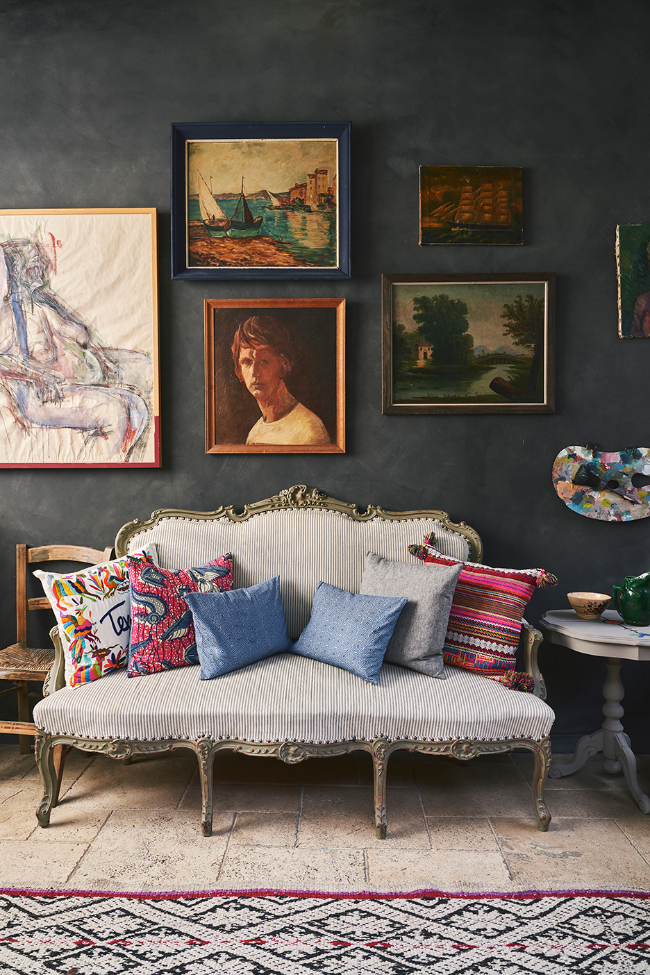 In some corners, art is the star; in others, it’s the wall itself that’s the shining moment. One of the easiest ways to add texture to a surface is varying how hard you press on a foam roller, notes Sloan. The technique results in a cloudy, plaster-like finish, as seen in the space above. “People always ask me: What did you do there?” It’s just the way you put it on,” she says matter-of-factly.