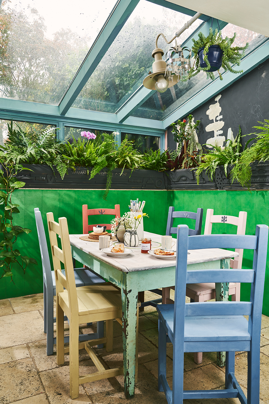 The low ceilings open up into a sunlit breakfast nook lined with plants. The greenery is there not only because it helps bring the garden vibe indoors, but it prevents the ledge from becoming a landing spot for clutter. “The problem with shelves is they end up a mess,” she says, laughing. Pens, drinking glasses, books, dirty dishes—she, her husband, and their three sons were all guilty of dropping their stuff there before the addition of the Graphite black trough made out of reclaimed pieces of wood (think: old picture frames, molding, and bits of chairs). Today it’s the perfect place for her houseplants to thrive. “I wonder if I hadn’t done what I do now if I would have been a gardener,” says Sloan. “It’s a dream. I love having my hands in the earth.”