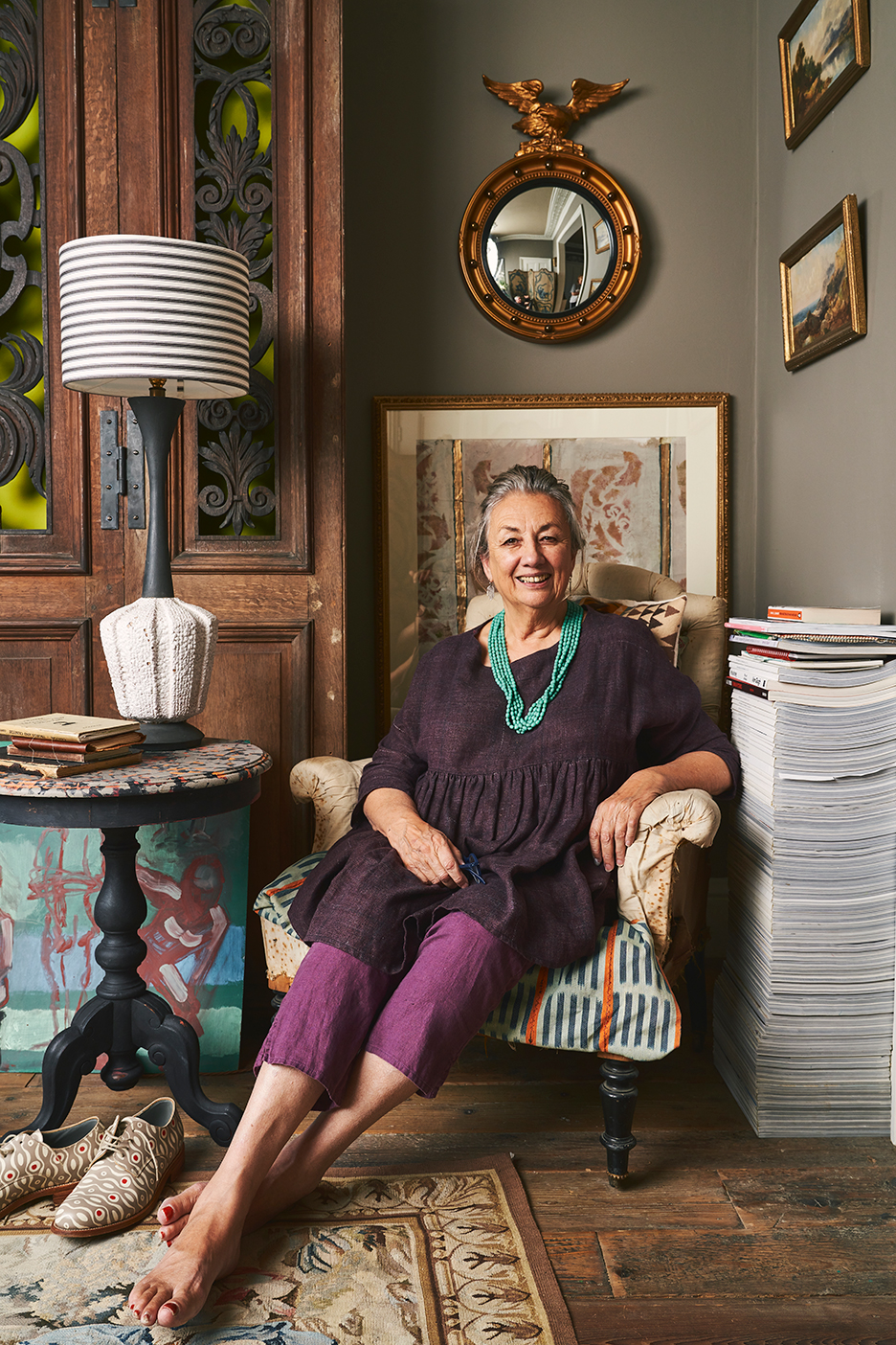 It was years before the couple decided to renovate the space. “When you make changes immediately, what you do is change your last house, not the one you’re in,” she explains. The only major addition came in the form of the breakfast room off the kitchen, now complete with a spiral staircase and a glass surround that offers views of the backyard. “The garden is very much a part of the house,” notes Sloan. But with the new, there’s still plenty of old: objet d’art passed down from her father, a headboard she and her husband built out of reclaimed wood, original ceiling moldings. Suffice to say, her house was cottagecore before cottagecore was cool. “I love getting back to chintz,” she says in approval of the trending style. “Then there are certain things I never want to bring back—macramé is one of them.”