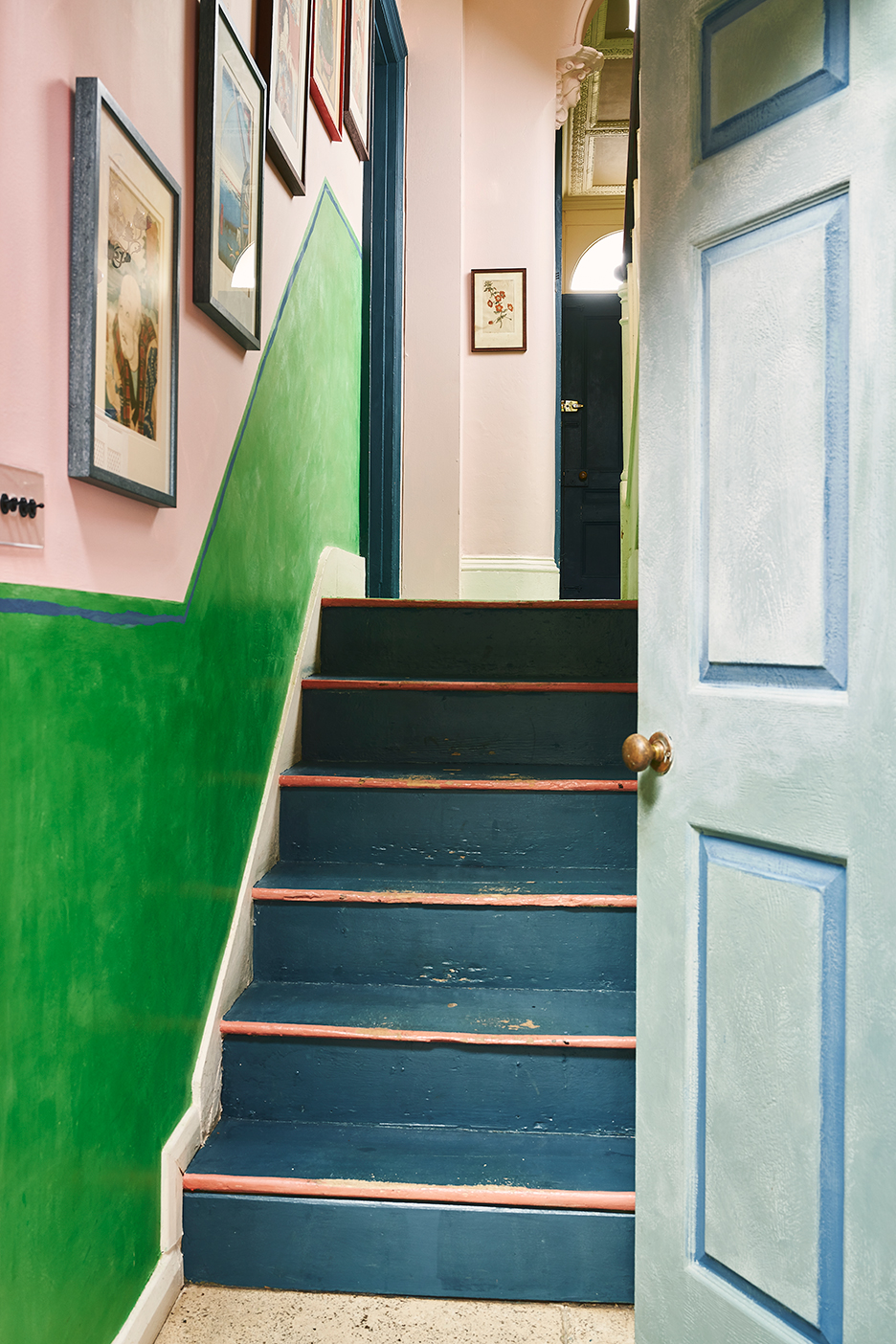 The heavy dose of Antibes Green leading to the ground-level kitchen was inspired by a pre-COVID vacation Sloan took to Cuba (her Greek-Italian grandfather lived there for years). She brought the inspiration full circle by hanging paintings she sourced on her trip on the Antoinette pink wall.