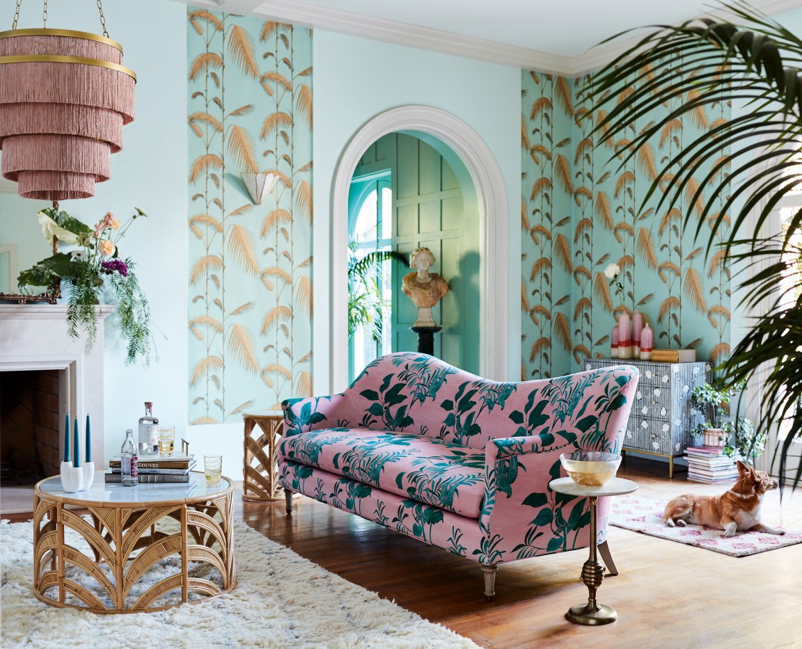 Pink sofas are our favorite living room eye candy, but this botanical rendition takes the classic to a new level with leafy greens.
