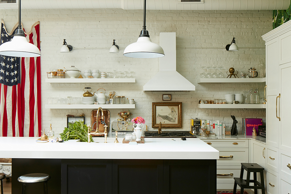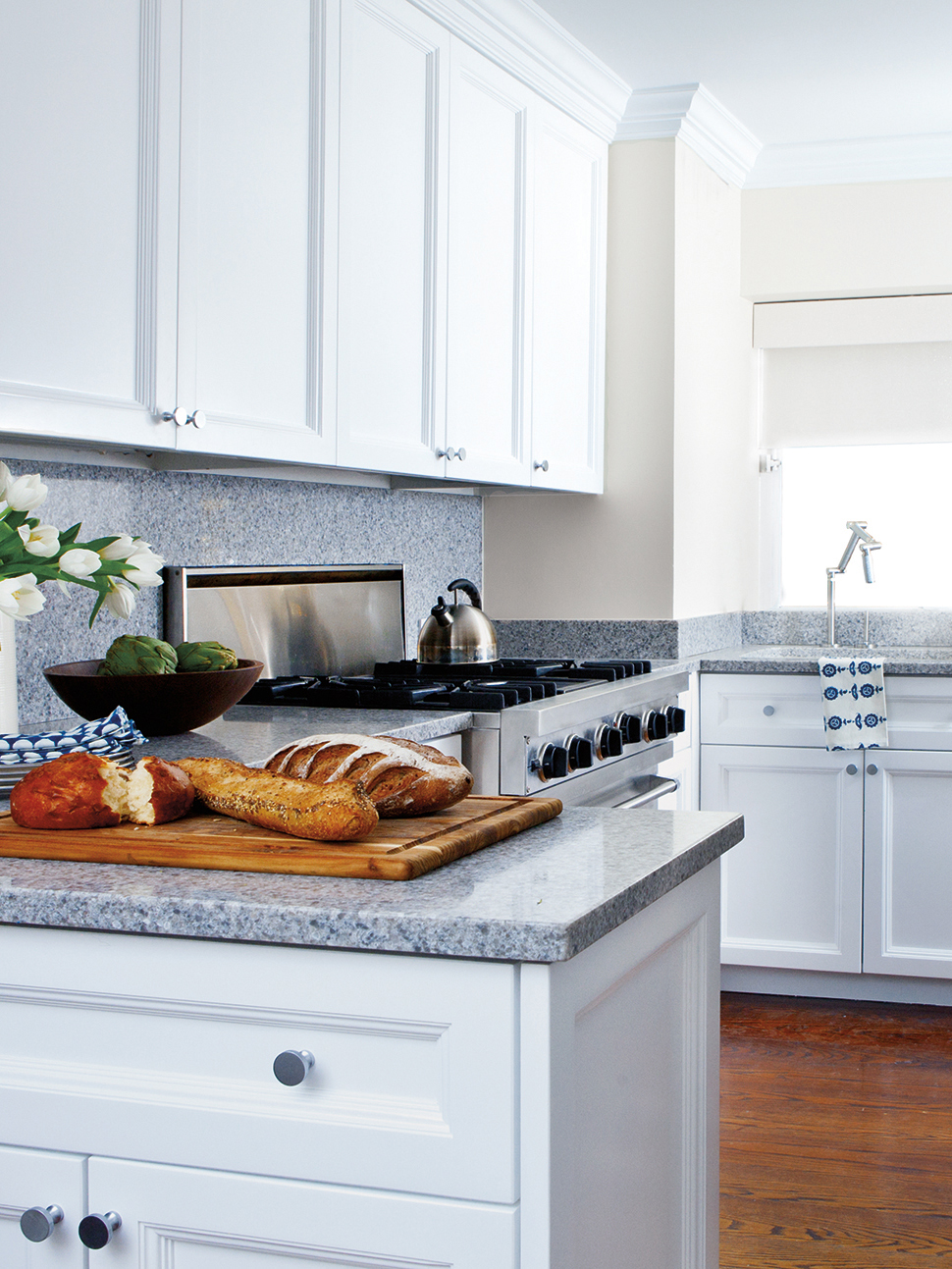 Rather than tear out the cabinets in this remodel, designer Young Huh opted to transform the originals with a bright shade of white and pair it with an eggshell wall color, complementing both the gray counters and the dark wood floors. The fresh coats have a bonus effect: making the room feel larger.