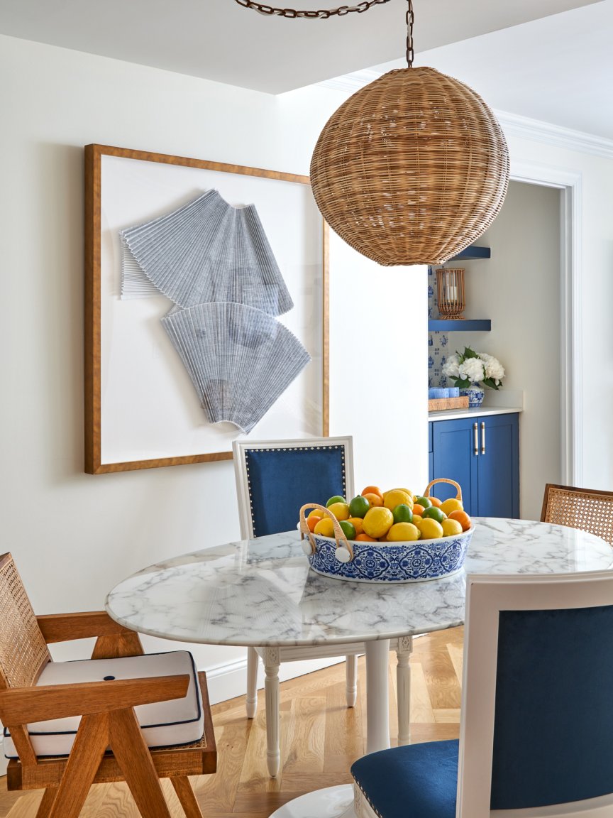 The apartment doesn’t get much sun, so brightening it up was a must. “I love the way West Coast homes seem to just ooze natural light, particularly that Santa Barbara, Montecito vibe, so I tried to bring a little of that to the Upper East Side,” says Okin. Various shades of blue, fresh flowers, and natural textures like bamboo and rattan mingle with crisp, tailored pieces.