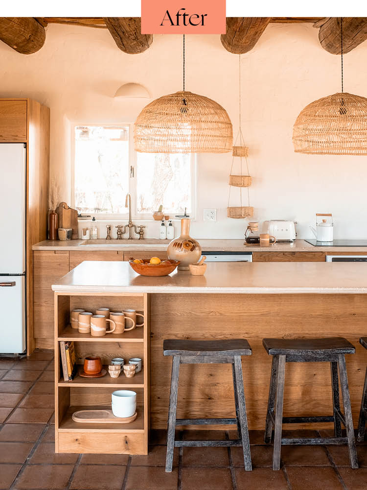 The origins of the building are still a bit of a mystery to the couple, but they think it started off as condos for employees at the nearby Arizona-Sonoran Desert Museum, an outdoor learning center teeming with the state’s wildlife (think: skyscraping saguaro cacti, like the kind you see in cartoons; roaming coyotes; and javelina pigs). What they did know when they closed on the 38-acre property in October 2018 was that they had a lot more to do than just give the place a fresh coat of paint (although that was definitely a must, too). The dining room didn’t have a floor, the exterior needed nearly endless patching, the roof had seen better days, and the kitchen didn’t yet exist.