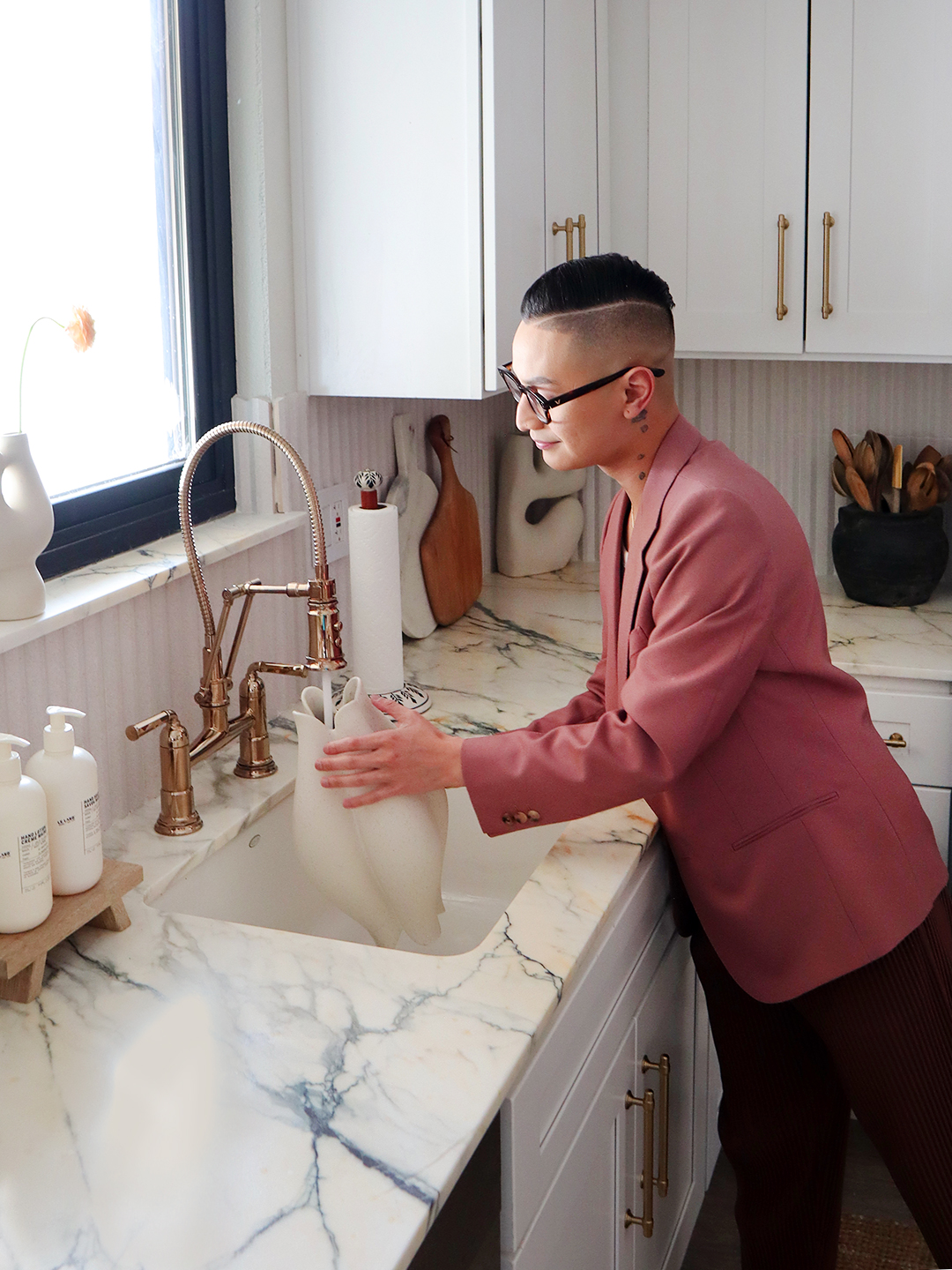 For Olano, painting the cabinets (often the first order of business for many kitchen renos) was never in the cards. “The prices we got quoted were insane—and Lord, don’t make me do any DIYs because I will ruin it,” he says, laughing. He focused on more nuanced changes instead, like trading the quartz countertops for a marble with lots of movement (Calacatta Paonazzo, which he found on sale). “I have this fascination with Italian marble, and you just can’t fake the color and veining you get from natural stone,” notes Olano. “This slab ended up being the catalyst for the whole project.”