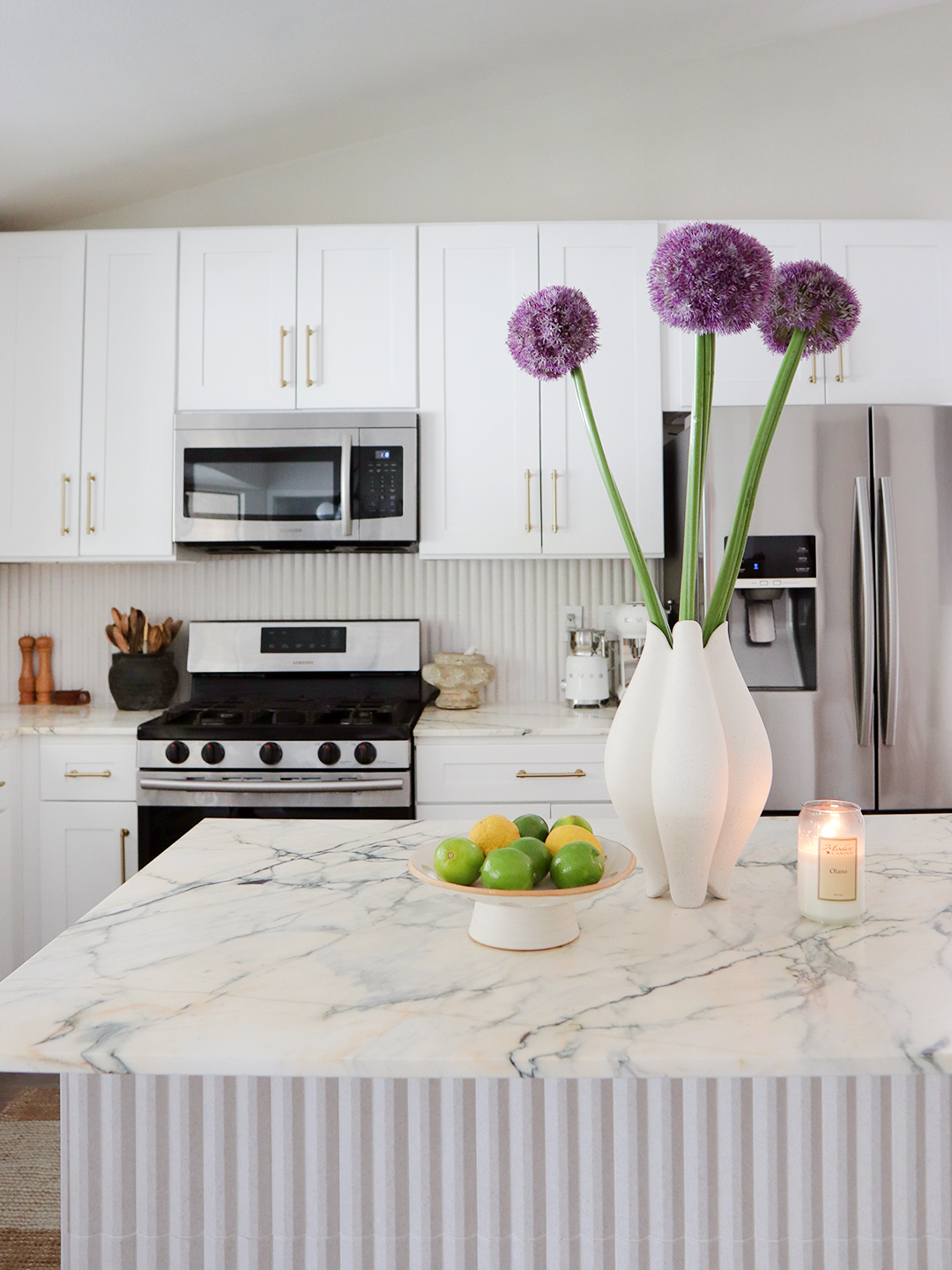 At first Olano had plans to carry the eye-catching marble up the backsplash for one seamless surface. Then he got a disappointing phone call—after they’d already purchased the slab. “I was so focused on getting this marble that I didn’t measure the backsplash,” admits Olano. “So when they said, ‘You don’t have enough to do a backsplash, sir,’ I about fell to the floor!” Swallowing a hefty restock fee wasn’t in the cards, so Olano improvised, choosing an unglazed cream tile backsplash that allowed him to play with the fluted texture he’d seen (and loved) in European kitchens. The accident ended up being a happy one—Olano loved it so much that he then added tile to the base of the island, as well.