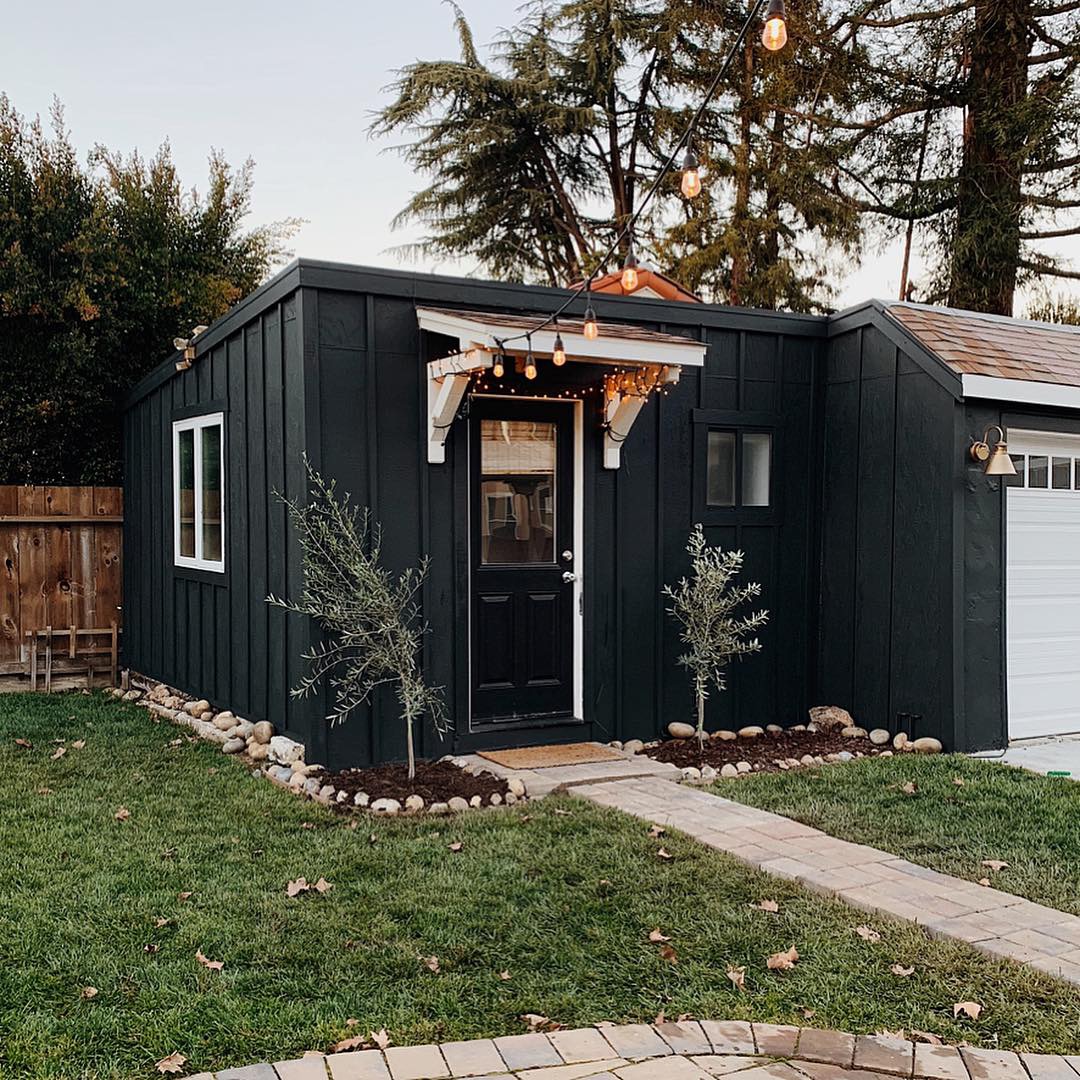 What’s more, she DIY-ed most of the reno projects with the help of her family. The fireplace that anchors the living room, for example, is the product of faux brick found at Home Depot that Petrone painted black for a high-contrast statement. They also revamped the guesthouse in the back (which she and her husband plan to Airbnb) with board and batten strips on the outside, shiplap on the bedroom walls, and an updated bathroom, finished with help from her mom.