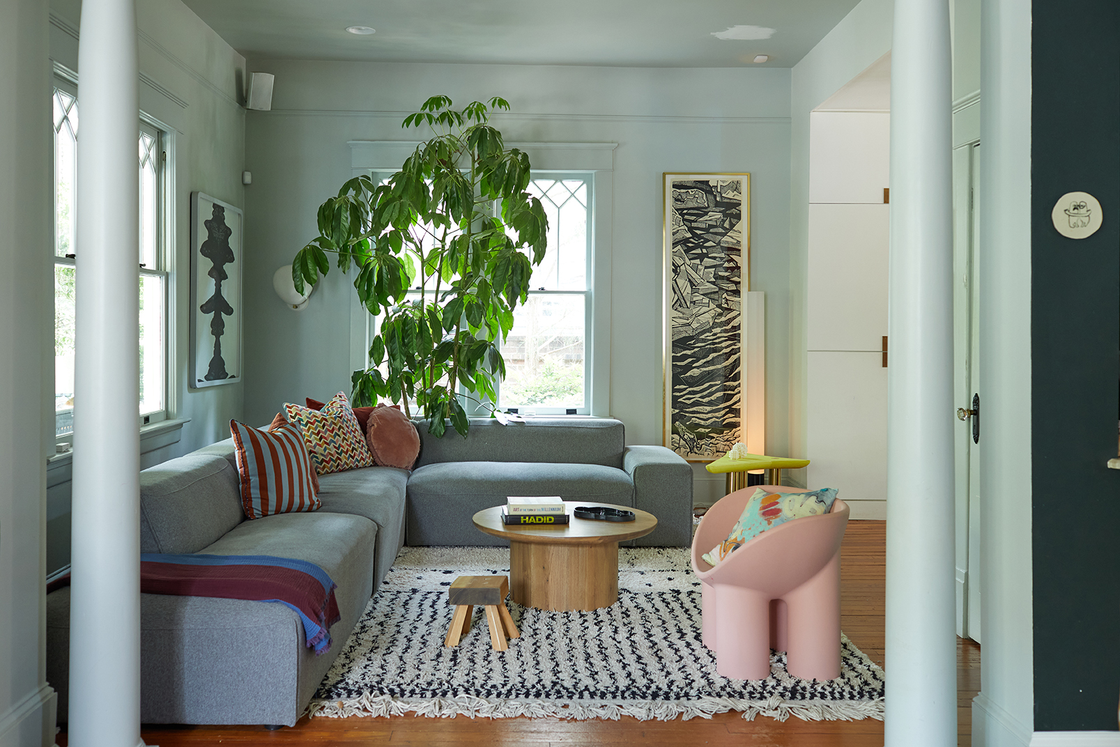 “I wanted to pay respect to the historic features of the home,” Kate says of designing the three-bedroom, two-and-a-half-bath property, where they’ve lived for almost five years. “But I also like the idea that you can just add these modern, weird elements and have [things] almost pop out more because of that contrast. We’re a family that really values fun, and I wanted that to shine through.”