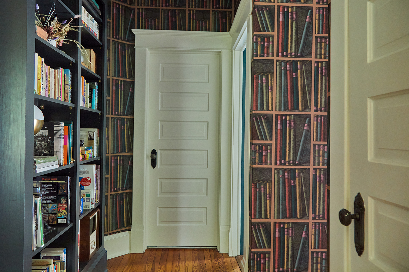The black and white theme carries into the kitchen, a product of a ’90s makeover by the previous owner that Kate loved. She changed little about the space, save for installing Cole & Son’s dreamy Nuvolette wallpaper on the ceiling (a pattern Jack jokingly refers to as their “pandemic paper,” given the excess black clouds lingering overhead), switching out knobs, and adding quirky anime art. “I realized that one of the common themes throughout the papers I chose for the home is some sort of Surrealism,” explains Kate, who also covered the hallway and stairwell in Cole & Son’s Ex Libris. “I like styles that feel kind of trippy but really pretty, too.”