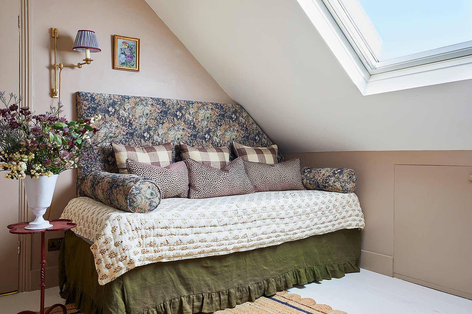 In order to comfortably fit a desk and chair, a pull-out bed was the only option. Laura bought a basic double daybed and dressed it with tonal soft textiles, including a custom-made linen valance, an Indian block-print quilt, and an abundance of cushions. What really anchors it is the headboard, which was made by a local upholsterer from plywood (and clad in fabric from Mulberry Home) and is angled into the sloping wall. Matching bolsters at each end create the illusion of a proper sofa.