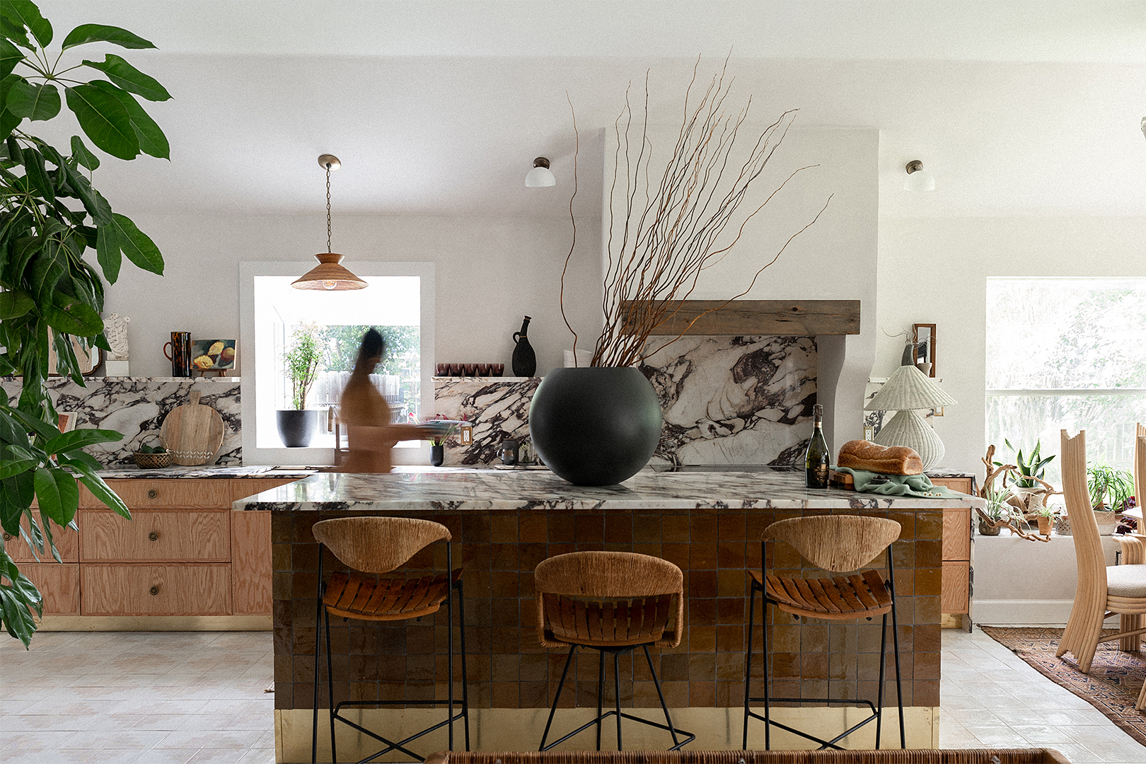 Grounding the dramatic stone was also important to Noor. While she may self-describe as eclectic, she has a minimalist side, too. A maroon zellige tile on the back of the island mirrors the marble’s hues, while brass footing along the cabinets adds a punch, not unlike what earrings do for an outfit.