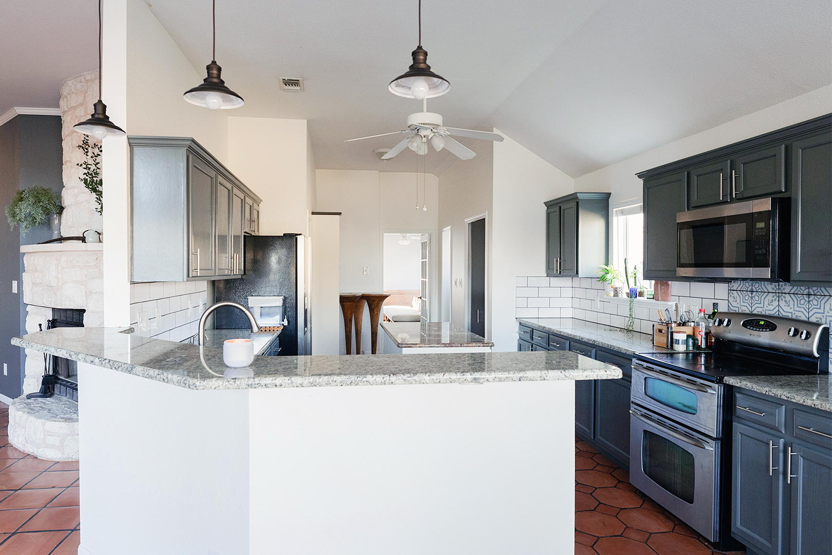 The kitchen and adjacent dining room, the most cookie-cutter spaces, were first on the upgrade list. Noor cooks almost every meal at home—she’s known for her tachin recipe—so not feeling isolated from her frequent guests was the first priority. Tearing out the floors, a wall of cabinets, and the too-skinny island opened up the room to the living room.