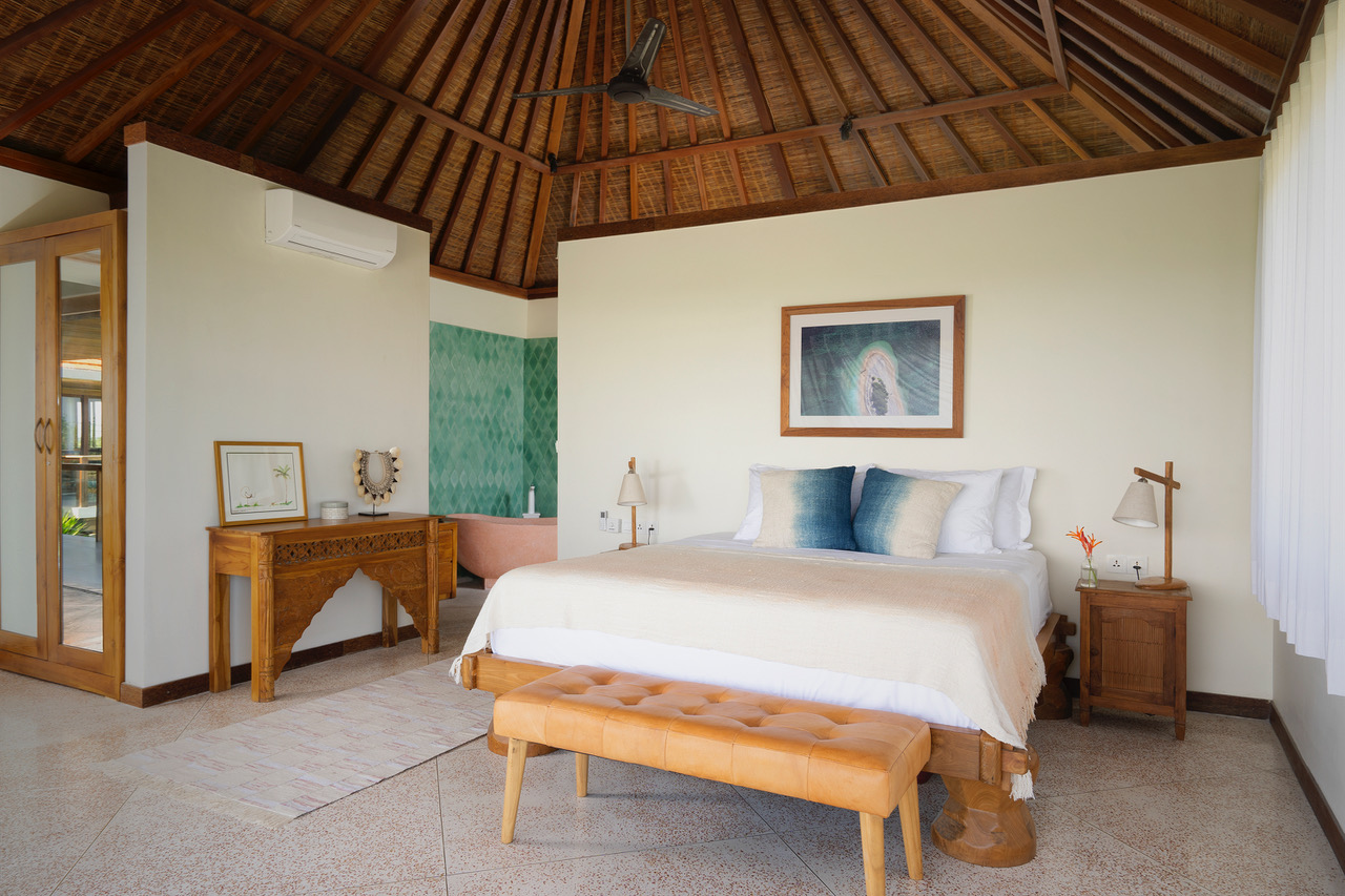 Romeyn saw it as an opportunity to work with local artisans to make the furniture as custom as the architecture. “I found a picture of a bed that I loved on Pinterest; it had these big, chunky legs—but there’s nothing like that already made in Bali. So I found a guy who could make that bed for me. He spent a couple weeks finding pieces of reclaimed teak that were big enough that he could carve into those shapes and create that bed.”