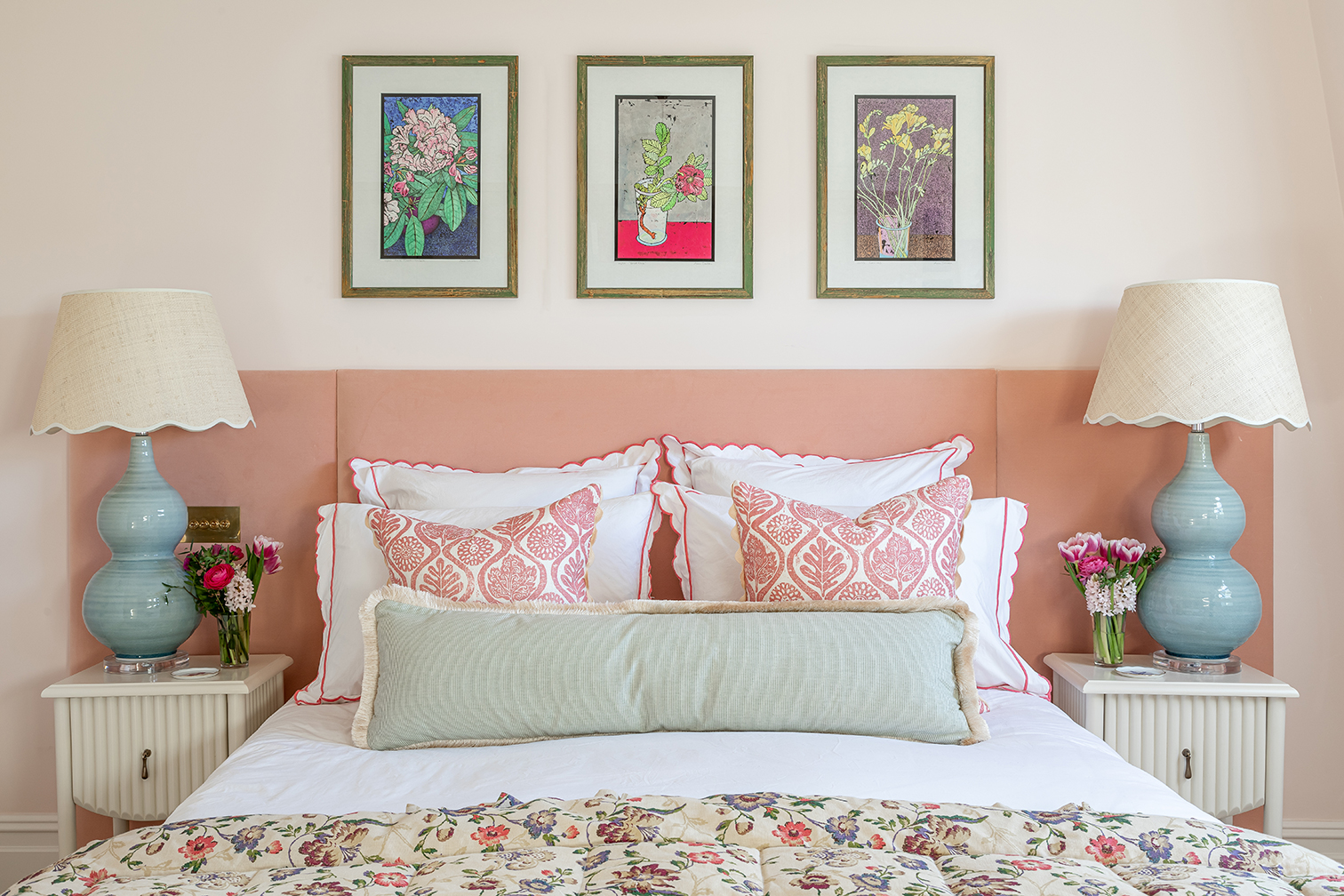 Things get bolder (and more British) in the guest rooms: In the smallest one, Lucy framed the headboard with built-in wardrobes and matching fabric-lined doors (with alcoves for a glass of water or a book). “It’s perfect for someone who has just come over with a little suitcase,” she says. The larger one, reserved for the couple’s mothers, got a blush treatment: “We wanted it to feel like afternoon tea at the Ritz,” says Dana.