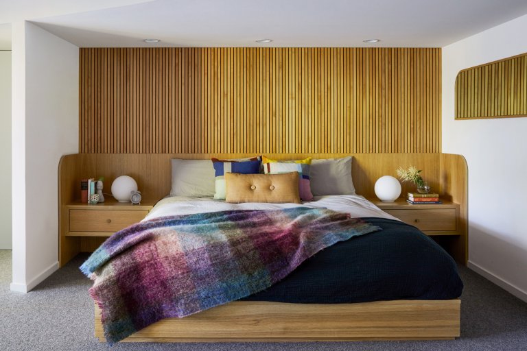 In the main bedroom, a step that cleverly disguises the radiator leads to a new outdoor terrace (previously just the roof of the living room). Wanting to keep any new additions out there as lightweight as possible, she went with plastic deck tiles from IKEA and groupings of planters from Design Within Reach.